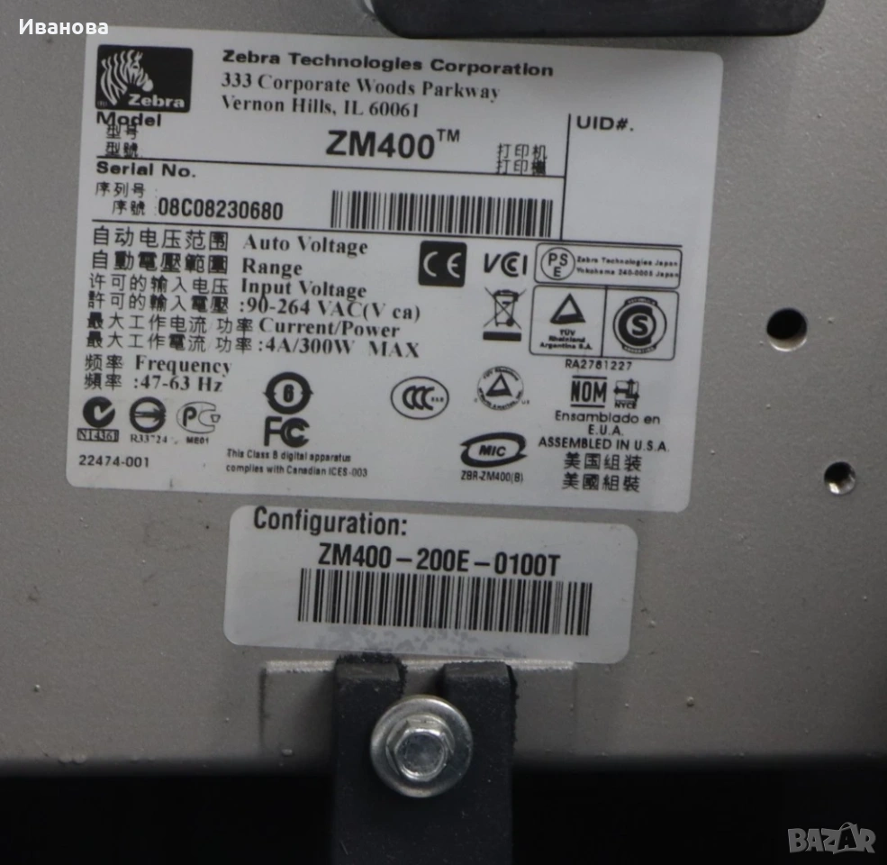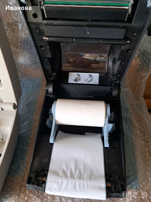 Термопринтер за баркод етикети Zebra GK420d, в добро състояние, напълно тестван и работещ. Вижте снимките за тестов печат и за действителния артикул. Ширина на печат до 4, идеален за етикети за пощенски/куриерски пратки с размери 6x4 или 4x4. Резолюция на печатащата глава: 203DPI. USB/Ethernet интерфейси: Принтерът се предлага с оригинално захранване Zebra, захранващ кабел