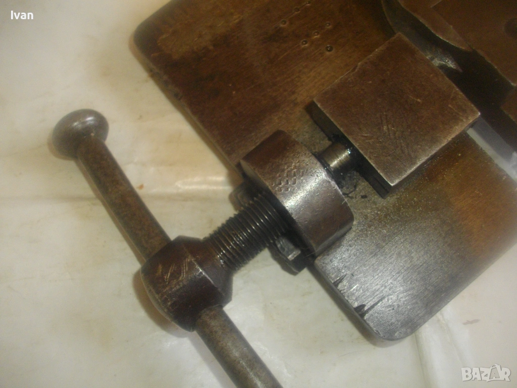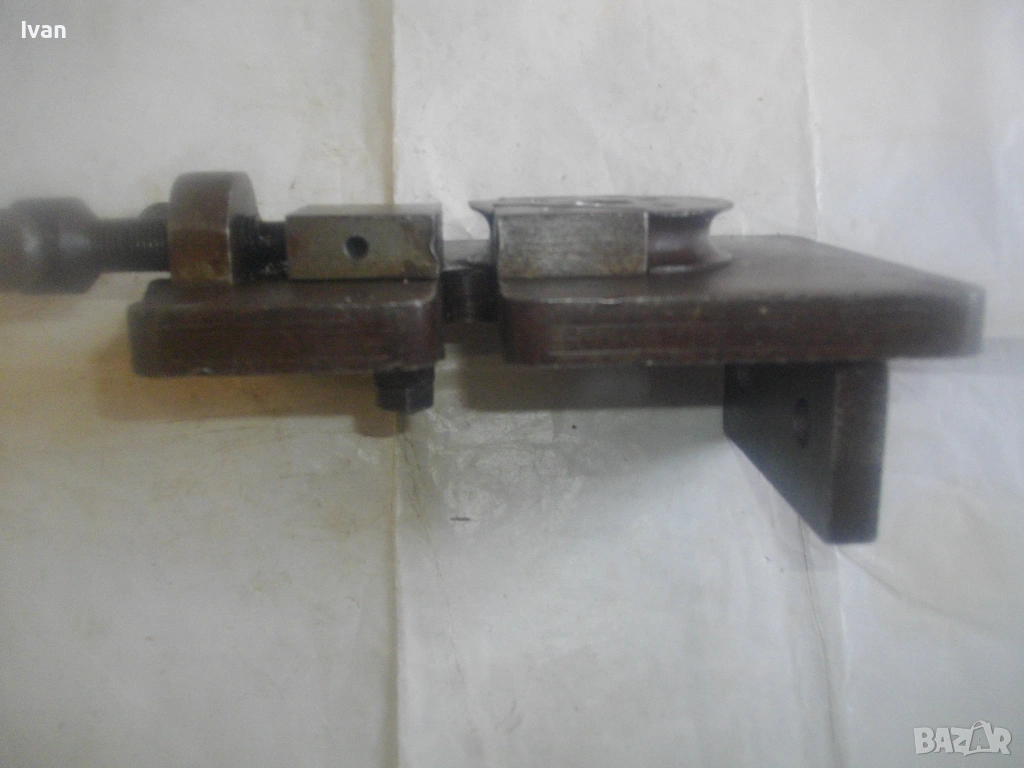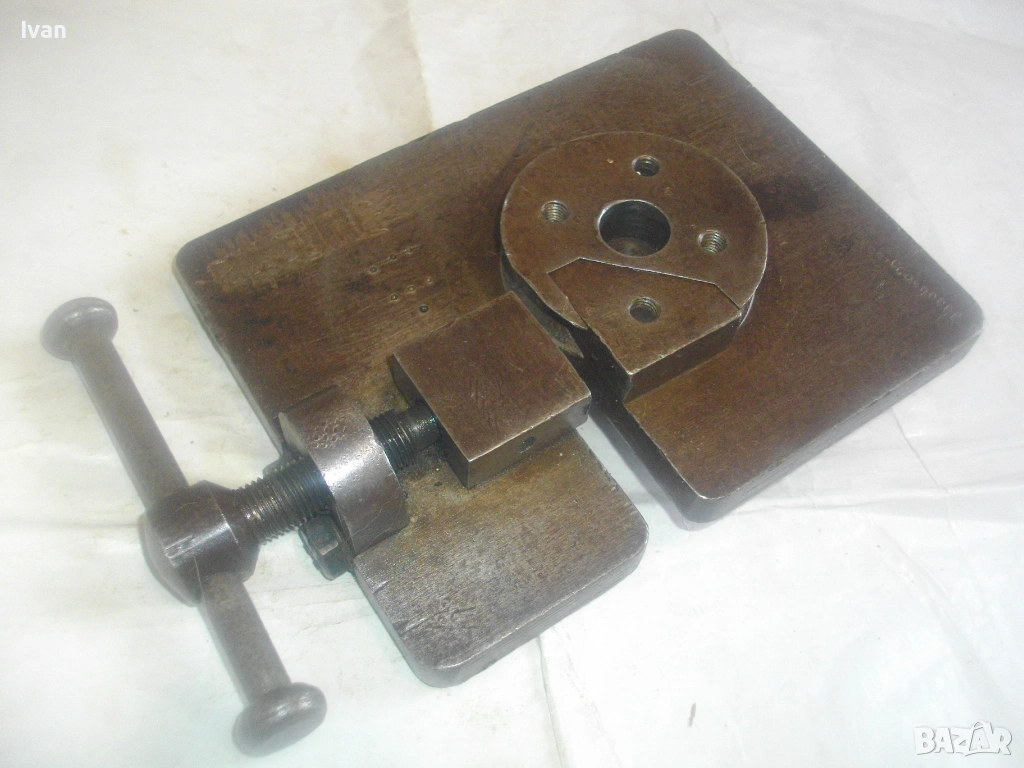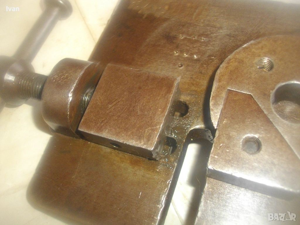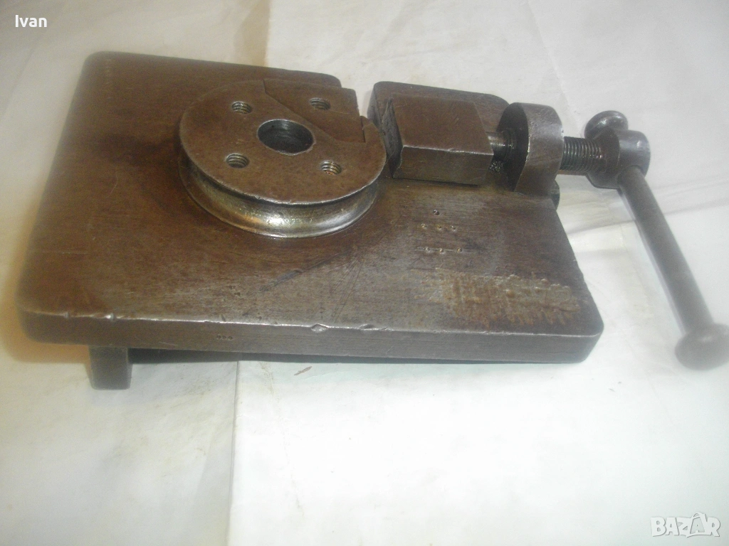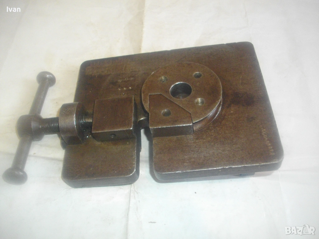 Старо качество масивен ръчен инструмент Универсален огъвач за метални профили, който служи за огъване на метални листове и пръти, за изработване на различни декоративни елементи от метални профили: шини, квадрат, кръг и т.н.. Уредът е лесен за използване и изисква минимална поддръжка. Инструментът е изцяло от масивна закалена стомана, с масивна основа, която стой здраво и стабилно. Плочата основа е с размери 18 см х 14 см и дебелина 14 мм.От едната страна има отваряема стяга тип менгеме, с което се фиксира огъвания метален елемент. Кръгът пръстен за огъване е с диаметър ф 70 мм и жлеб за огъване 14 мм - огъва метален прът арматура профил макс до ф 14 мм. Отварянето на стиската притисквач менгеме е до 20 мм от кръглия пръстен за огъване. На основата плоча има канал, в който се придвижва ръчно огъвания елемент.От другата страна отдолу на основата регулираща метална пластина стопер за застопоряването. Винта на въртока на менгемето върви съвсем леко, без запъване и без луфтове.Дължина на инструмента заедно с въртока на стиската притисквач - 23 см.