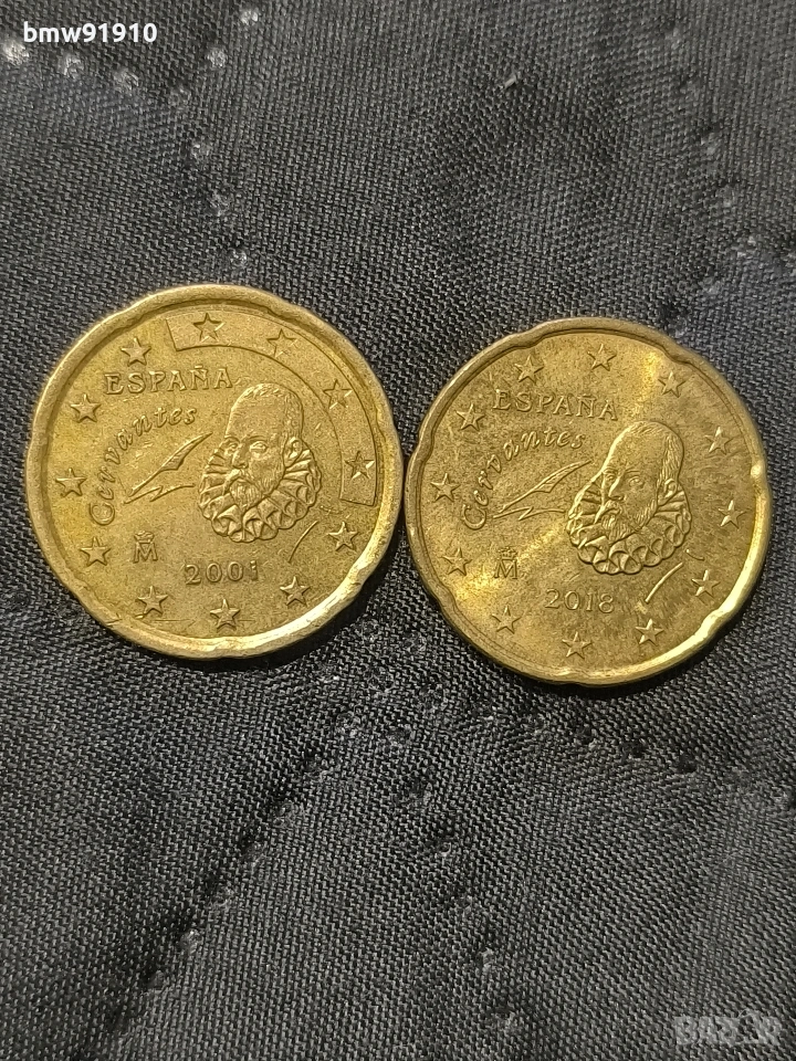Монетата, показана на изображението, е испанска монета от 20 евроцента от годината 2001 и 2018. На лицевата страна на монетата е изобразен Мигел де Сервантес, известният испански автор на 'Дон Кихот'. Монетата е изработена от нордическо злато, сплав от мед, алуминий, цинк и калай.