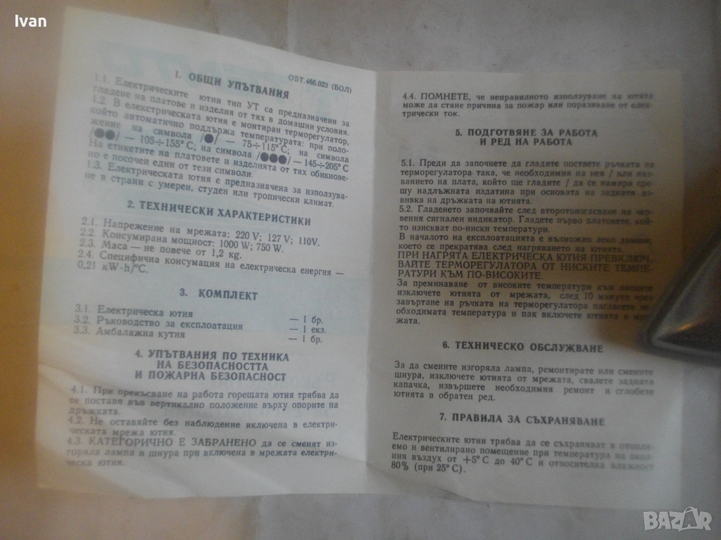 ВНИМАНИЕ: Налична е към ютията оригиналната документация на бълг.език /Ръководство за експлоатация и Свидетелство за приемане с дата и печат от 06.1989г. Налична е към ютията оригиналната картонена опаковка кашон от дебела тогавашна хартия картон.