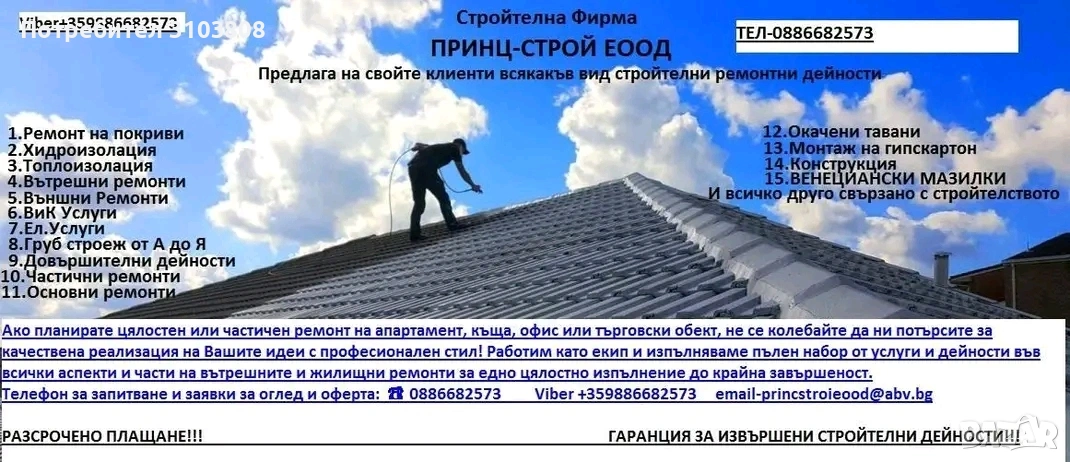 Ако планирате цялостен или частичен ремонт на апартамент, къща, офис или търговски обект, не се колебайте да ни потърсите за качествена реализация на Вашите идеи с професионален стил! 🔧🧱🔩⚙️👷♂️ НАШАТА СТРОЙТЕЛНА ФИРМА ПРИНЦ-СТРОЙ ЕООД за строителни ремонти изпълнява строително-ремонтни дейности и вътрешни ремонти в следните насоки: ✔ Довършителни дейности за нови жилища в завършена готовност до ключ; ✔ Цялостен основен ремонт на жилище апартамент / къща; ✔ Частичен освежителен ремонт на жилище; ✔ Основен цялостен или частичен ремонт на баня; ✔ Вътрешни или външни ремонти за къщи; ✔ Вътрешно преустройство, ремонт за усвояване на тераса в апартамент; ✔ Основен или частичен ремонт на кухня, монтаж на кухненско обзавеждане, ВиК услуги и други; ✔ Освежителен, частичен или цялостен ремонт на баня със или без подмяна на ВиК тръби и инсталации. ✔️ВЕНЕЦИАНСКА МАЗИЛКА (СТУКО) ✔️ДЕКОРАТИВНИ МАЗИЛКИ ✔️ГРУБ СТРОЕЖ ОТ А ДО Я + ДО КЛЮЧ ✔️РЕМОНТ НА ПОКРИВИ ✔️ХИДРО ИЗОЛАЗИЯ ✔️МАШИННО ПОЛАГАНЕ НА ЗАМАЗКИ ✔️ МАШИННО ПОЛАГАНЕ НА ШПАКЛОВКА(ТУРБОЗОЛ) ✔️МАШИННО ПОЛАГАНЕ НА БОЯ (ЛАТЕКС. И ДР) В зависимост от планираната идея на клиента, в заявения ремонт, в процеса на работа може да се включва: ✔ Първоначално къртене и изчистване на стари подови и стенни настилки; ✔ Цялостно или частично Къртене на вътрешни стени при необходимост от вътрешно преустройство в помещението, демонтаж или къртене мивки или вани, в зависимост от вида им; ✔ Зидане и изграждане на вътрешни елементи или стени; ✔ Поставяне на гипсокартон, окачен таван, растерен таван, шпакловка на стени и боядисване; ✔ Полагане на подови и стенни фаянсови плочки според избрания дизайн от клиента; ✔ Обработка на ВиК инсталации, частична или цялостна замяна на водопроводни тръби, щрангове и свързаните с тях елементи; ✔ Обработка на ел. инсталации, осветителни тела, оформяне на ревизионен отвор и монтажи на структури за вграждане. Работим като екип и изпълняваме пълен набор от услуги и дейности във всички аспекти и части на вътрешните и външните ремонтни дейности