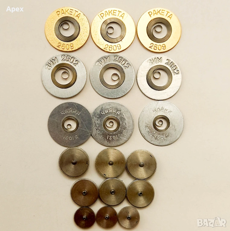 *КОЛЕЛА И ПРУЖИНИ: Двигателни пружини, секундни и минутни колела, междинни предавки.
