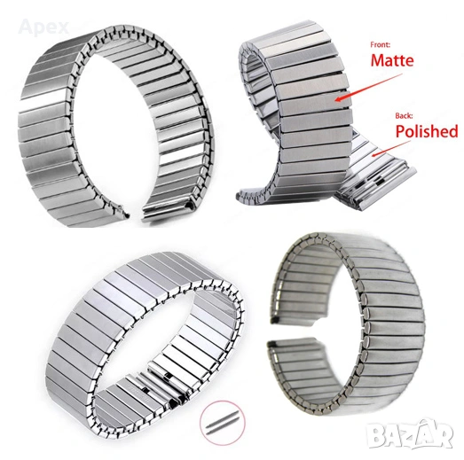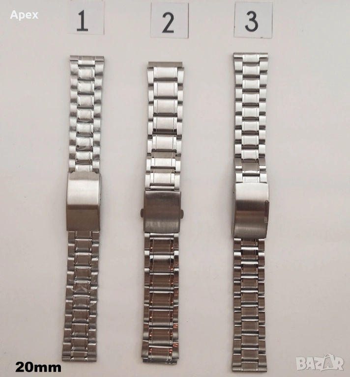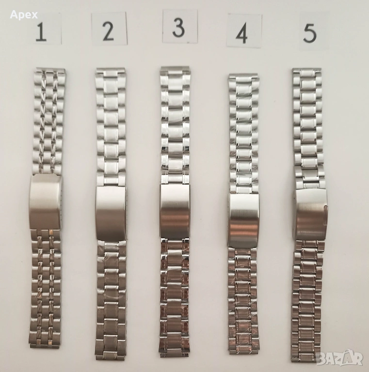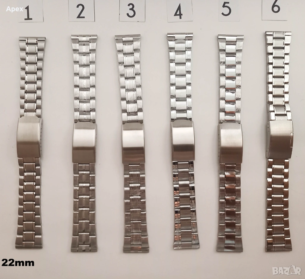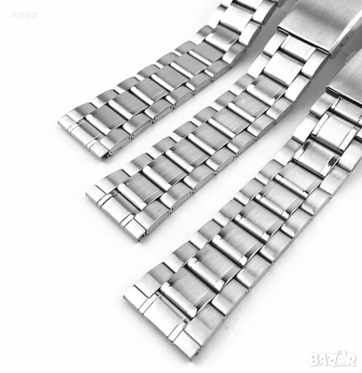 Ширина: 12мм, 14мм, 16мм, 18мм, 20мм, 22мм, 24мм, 26мм, 28мм. Възможност за лесно скъсяване. Разполагаме с модели с матови (Brushed) и полирани (Polished) звена, солидни звена (Solid links) и различни оплетки.
