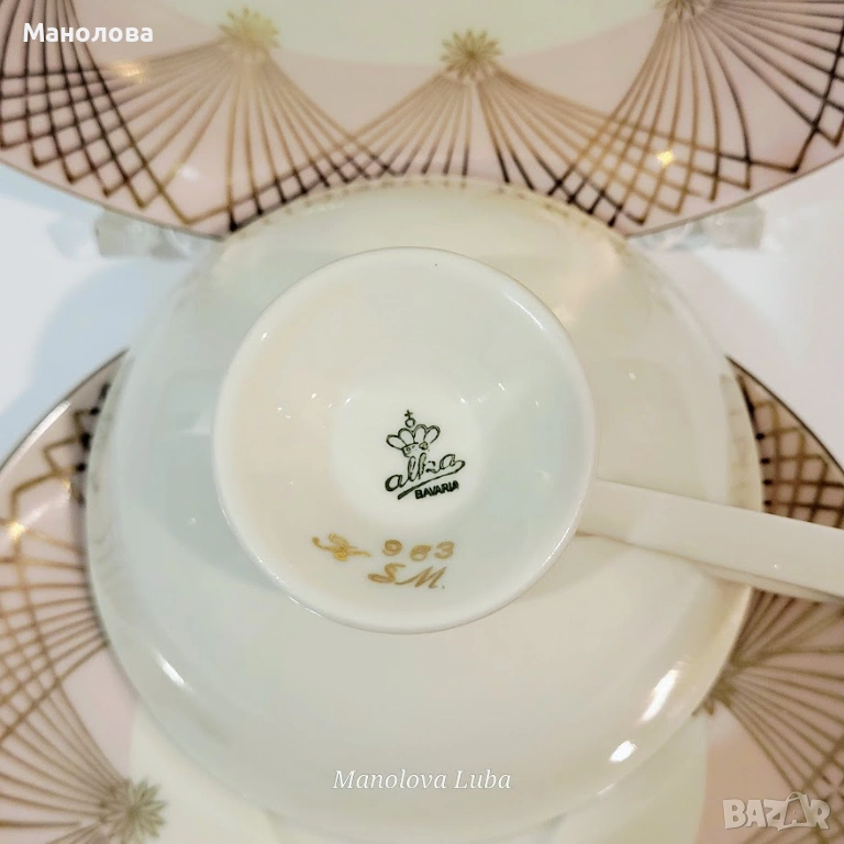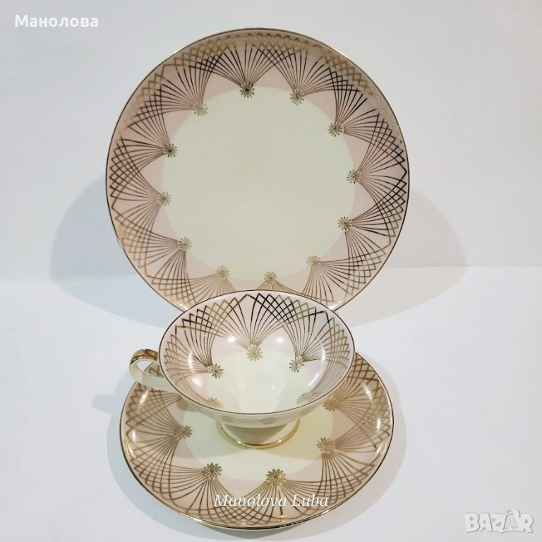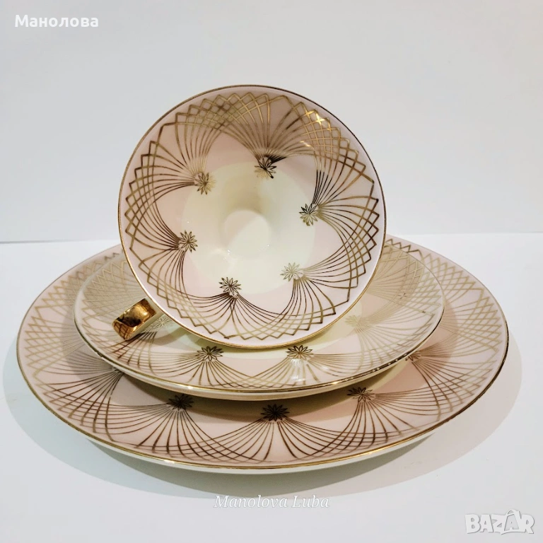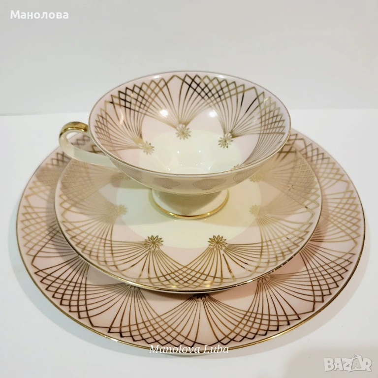В прекрасно ретро състояние. В стил Art Deco дизайн, отличаващ се с геометрични форми и линии. Нежен розов порцелан, декориран със сложни златни ветрилообразни мотиви. Номер на модела 963 SM . Няма чипове, наранявания и повреди. Моля разгледайте снимките.