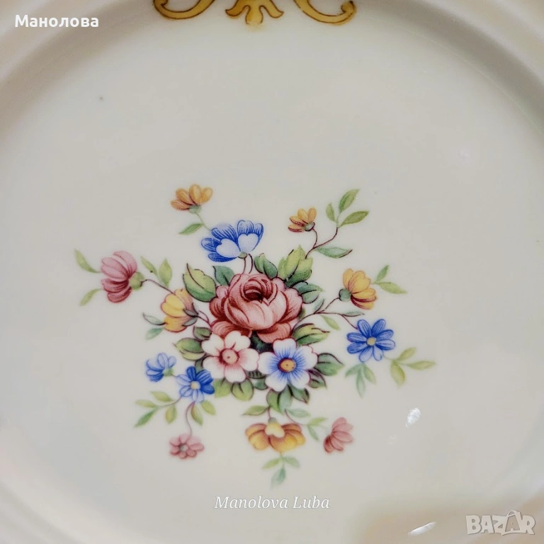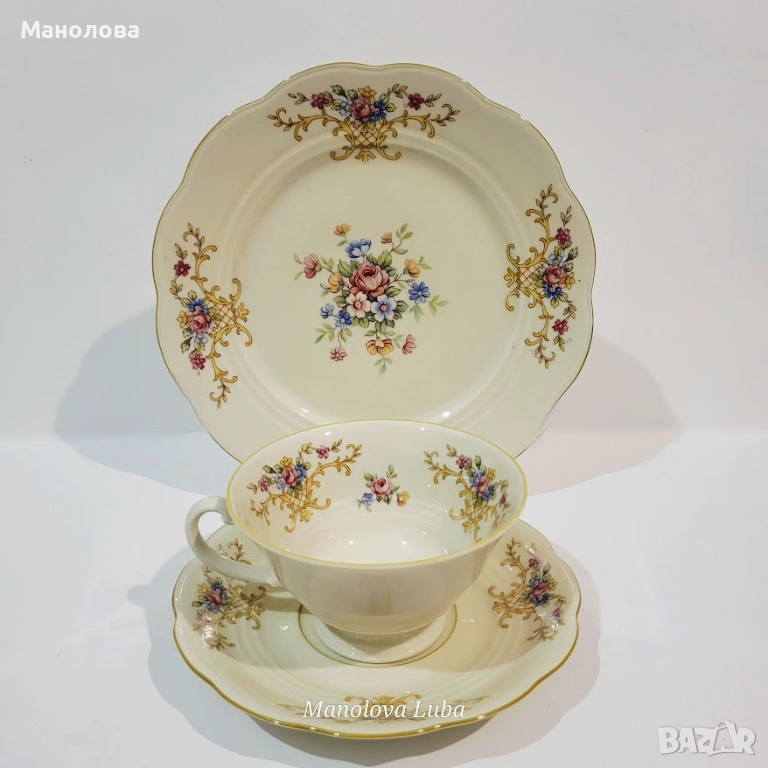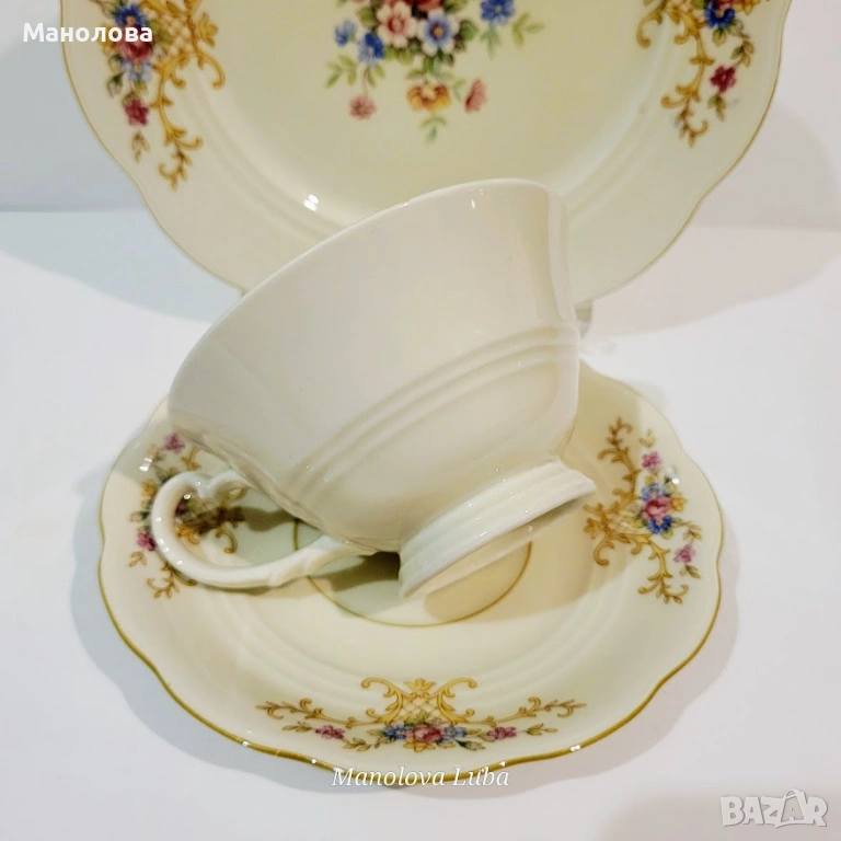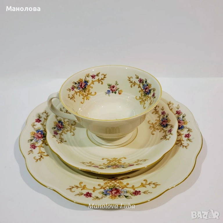 В много добро антикварно състояние, маркировката сочи производство 1931 - 1945 г. Класически дизайн с флорални мотиви и златен кант. Комплекта няма чипове и наранявания, моля разгледайте снимките.
