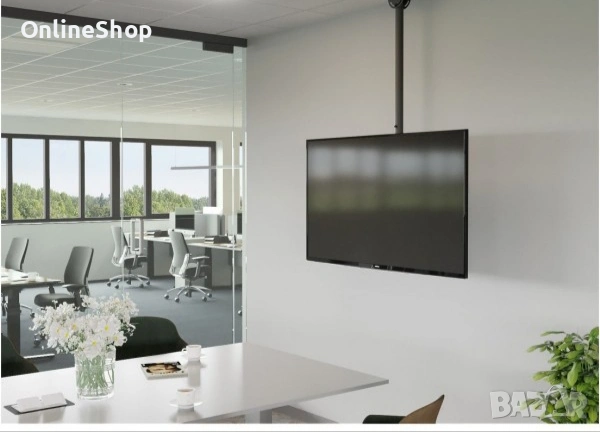 Универсална ТВ стойка за таван за вашия бизнес. Тази практична и удобна стойка за телевизор за таван е чудесен избор за вашия бизнес. Тежи едва 3 килограма, но е изработена от висококачествена подсилена студено-пресована стомана и може да издържа на натоварване до 25 килограма. Притежава семпъл и елегантен дизайн, който се вписва чудесно в различен стил на интериора и няма опасност да наруши цялостния вид ва вашето заведение, офис, магазин или друго. Телевизионната стойка е с лесен и бърз монтаж, а в комплекта с нея ще получите и всички принадлежности като винтове и дюбели, които ще ви бъдат необходими за сигурния и безпроблемен монтаж.