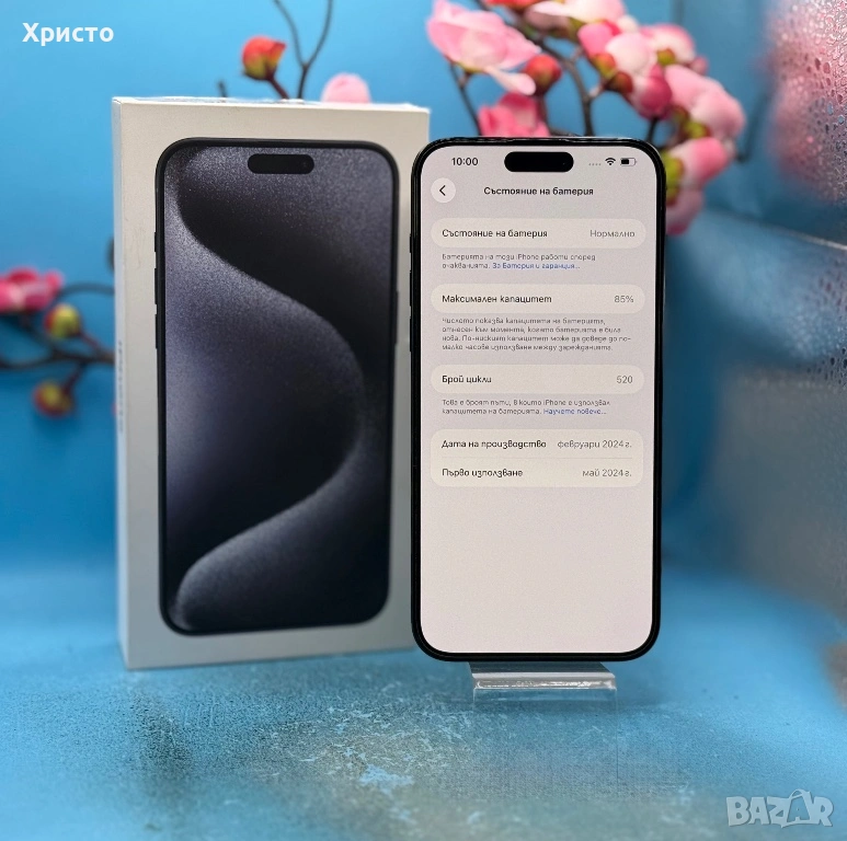iPhone 15 Pro Max 256GB в цвят Black Titanium. Телефонът е в отлично състояние, много запазен и без забележки по външния вид. Винаги е използван с протектори, което си личи от състоянието му. Работи перфектно, всички функции са напълно изправни и устройството никога не е било на сервиз. Телефонът е отключен и работи с всички оператори. Информация за живота на батерията и циклите на зареждане може да се види на една от снимките. Продава се с кутия, кабел и голям набор от аксесоари. Без бартери!!!