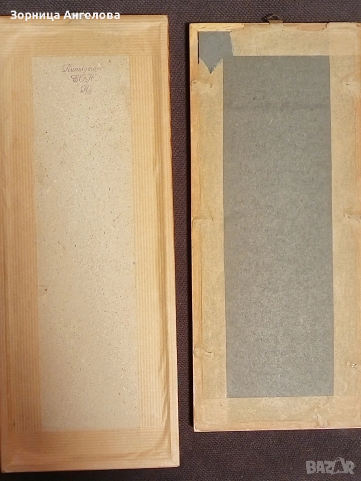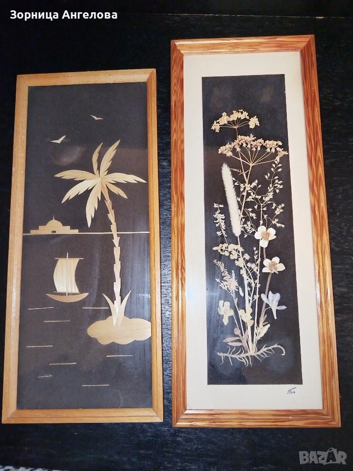 Винтидж пана от втората половина на XX век Автентично немско приложно изкуство от ГДР –ръчна изработка (интарзия от слама) върху черно кадифе. Размери: 35 × 13,5 см и 32 × 13,5 см Едното пано (с цветя) има подпис/щампа на лицевата страна и маркировка на гърба.