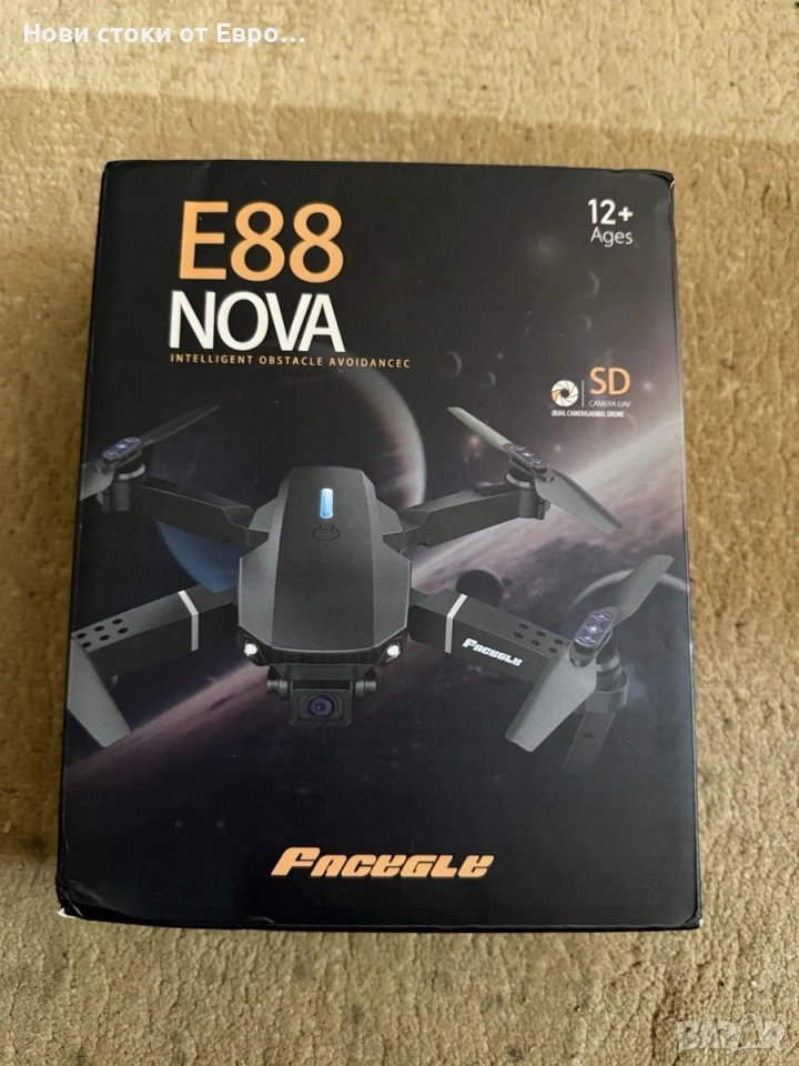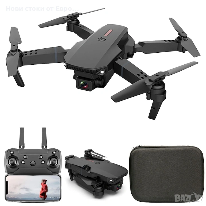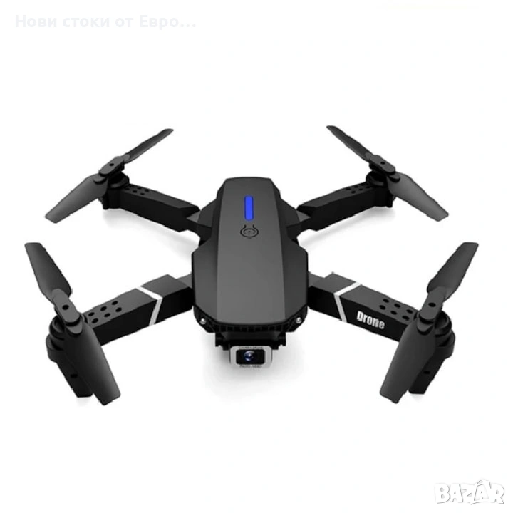 Дрон Fusion E88, dual Cam 4k, Wifi, 3х батерии Камера: Оборудван е с двойна камера (предна и долна) с резолюция SD (стандартна разделителна способност). Функции: Притежава интелигентно избягване на препятствия, режим "Headless" за лесно управление и възможност за управление чрез приложение за телефон. Свързаност: Поддържа 2.4 GHz безжично предаване на данни и WiFi връзка за предаване на видео в реално време. Време на полет: Обикновено предлага около 20-40 минути полет с едно зареждане на батерията.