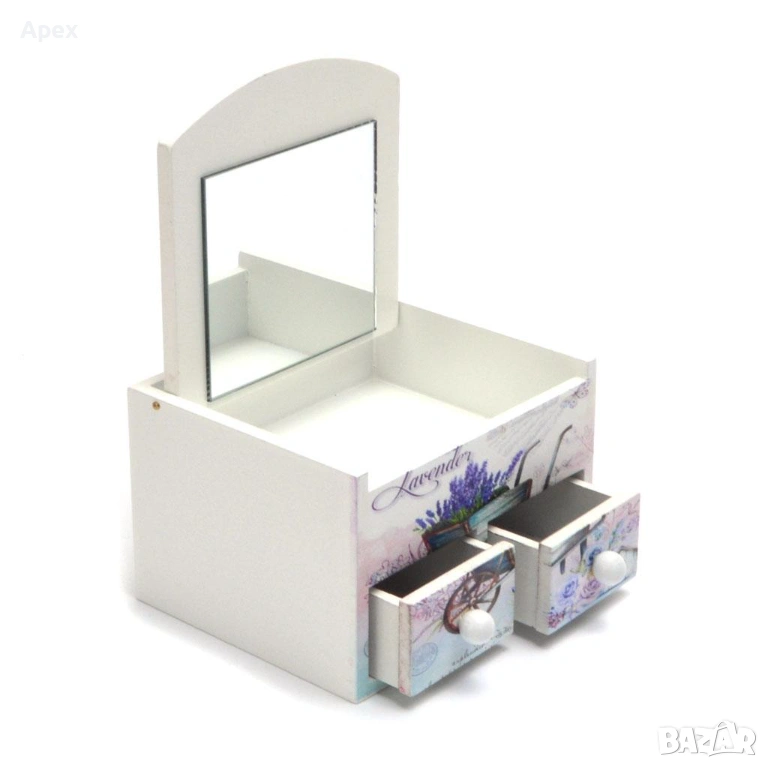 Стилна дървена кутия за бижута, декорирана с нежни флорални мотиви (цветя) * Практичен дизайн тип "мини скрин" с огледало на капака, едно горно отделение и две чекмеджета