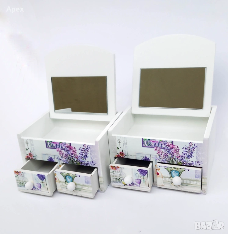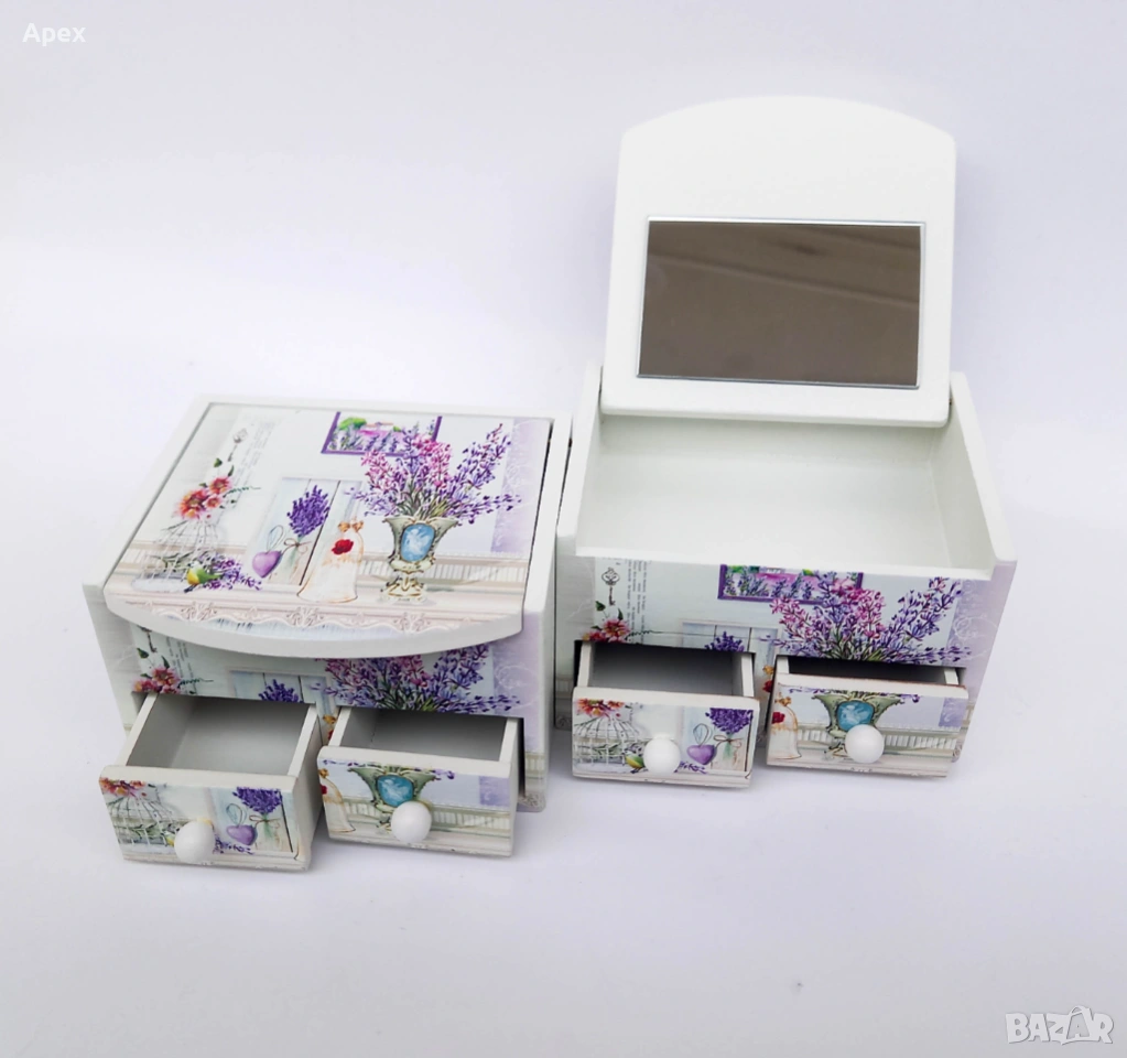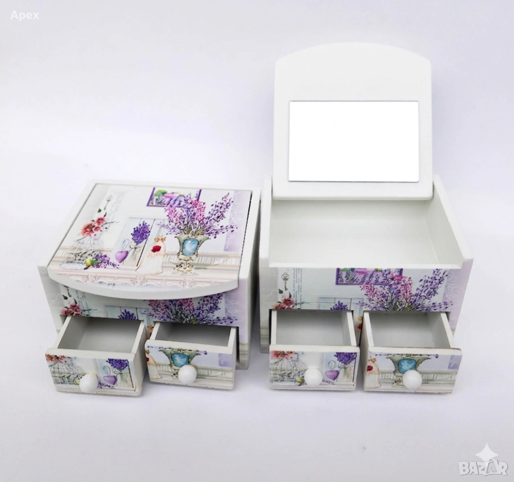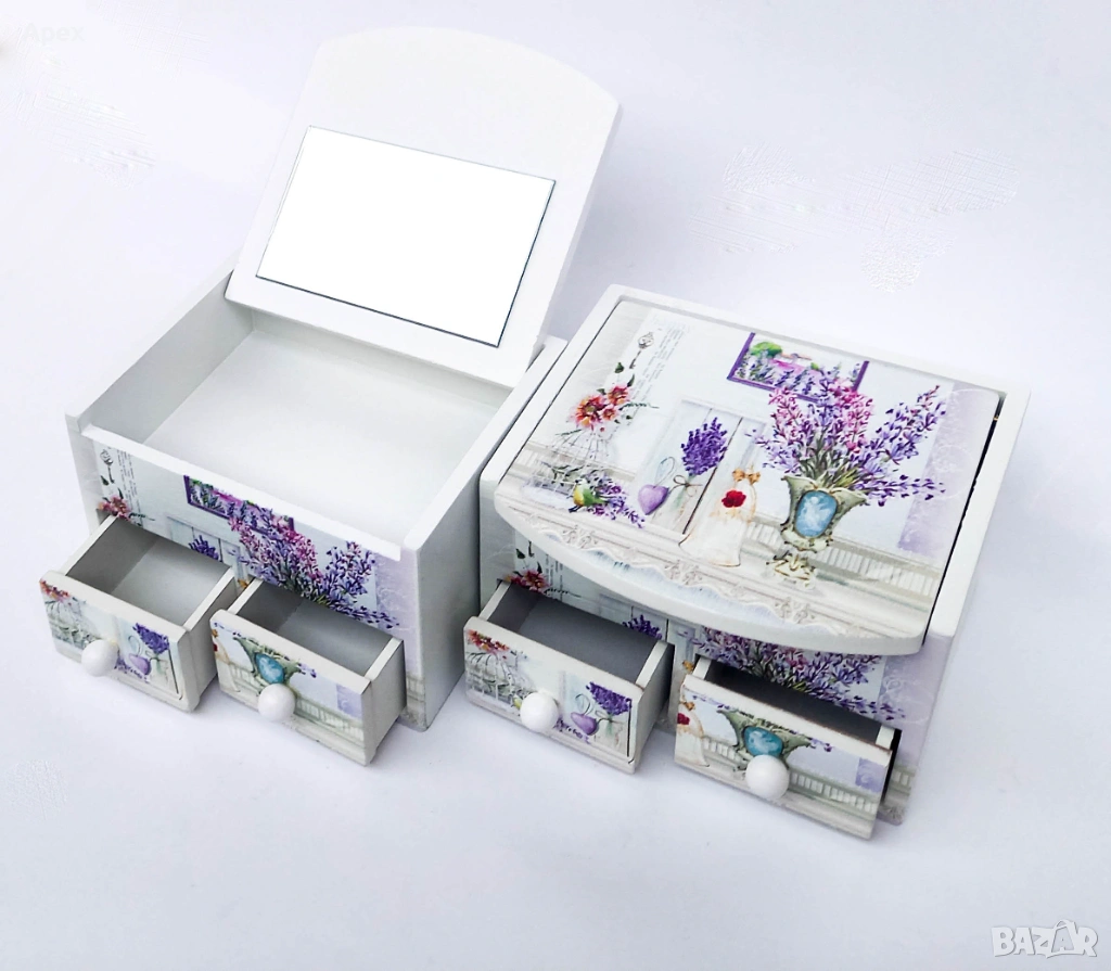 кутия за бижута, дървена кутия, органайзер за бижута, кутия с огледало, кутия с цветя, подарък за жена, декор за тоалетка, мини скрин за бижута, съхранение на бижута, кутия с чекмеджета, винтидж стил, цветен принт, дървен органайзер, бижутерка, подаръчна кутия, аксесоари за коса, пръстени и обеци, ръчна изработка, стилен подарък, декорация за дома, малка кутия за бижута.