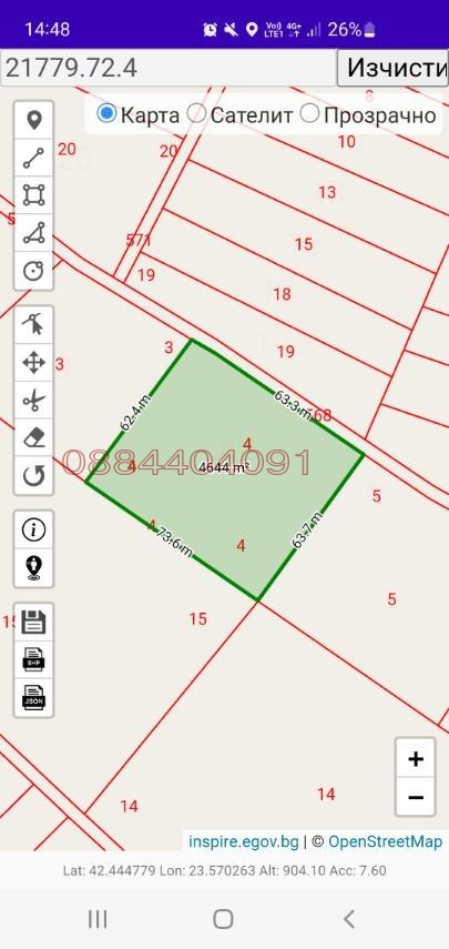 Поземлен имот с кадастрален идентификатор 21779.72.4 площ от 4,641 м2, област София, община Елин Пелин, с. Доганово, м. Терасите. Категория земя: ливада.