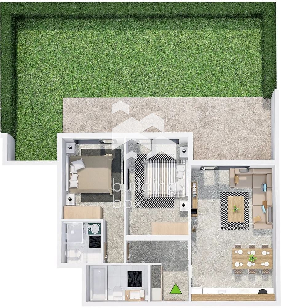 - РАЗПРЕДЕЛЕНИЕ: Просторна всекидневна с кухненски бокс с площ от 27.81кв.м, две спални, две бани с тоалетни и двор.