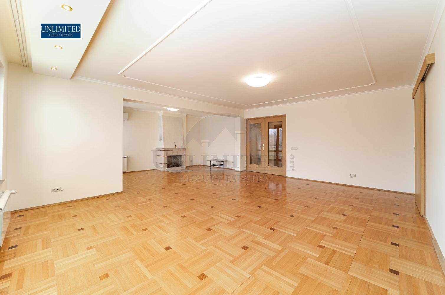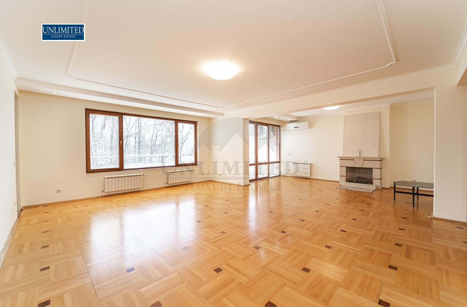 Страхотен апартамент с прекрасна гледка към парк. Състои се от: хол с камина, трапезария, отделна кухня, главна спалня със собствена баня, три спални, две бани. Климатик. Алармена система. Луксозни общи части.