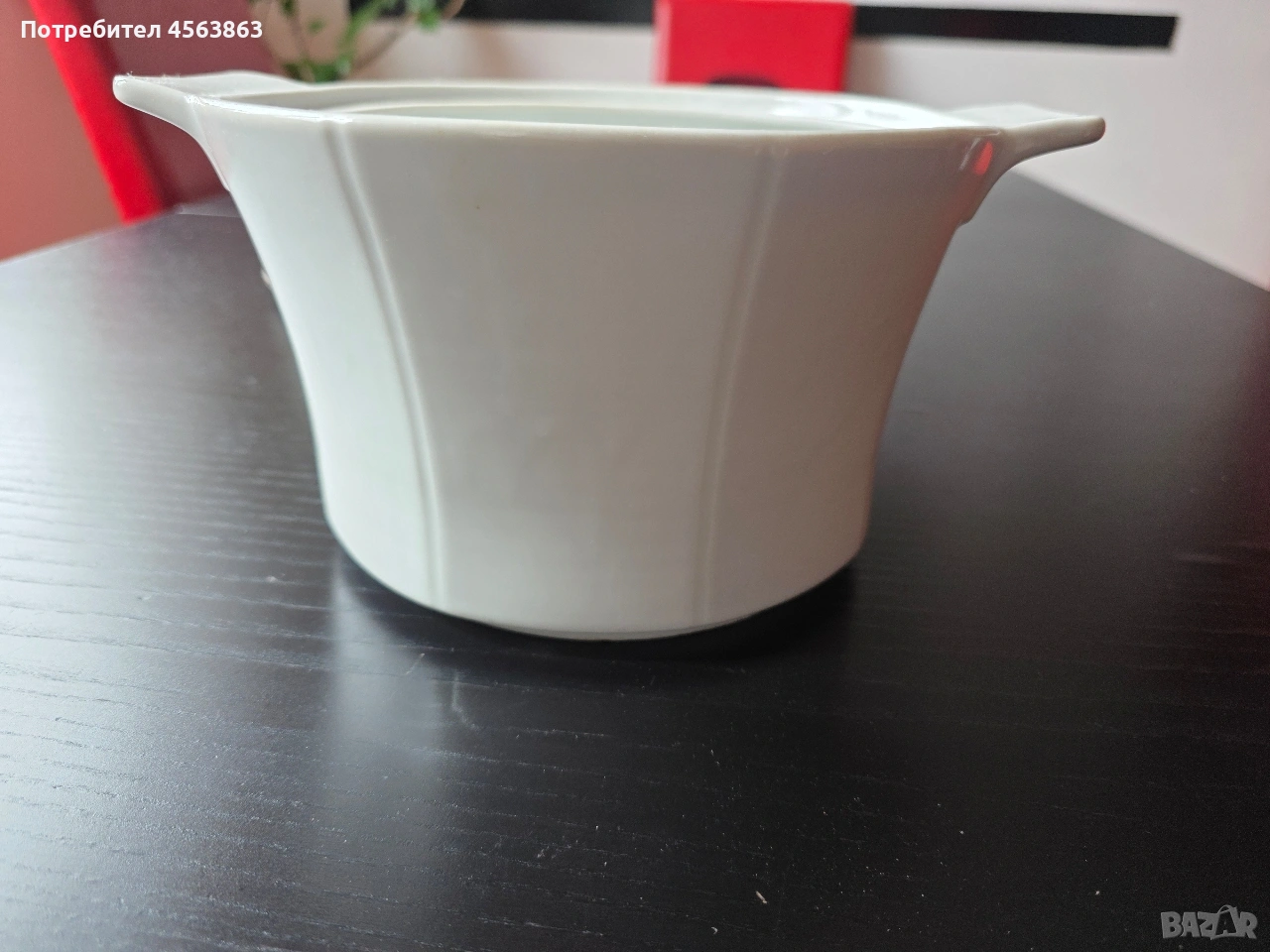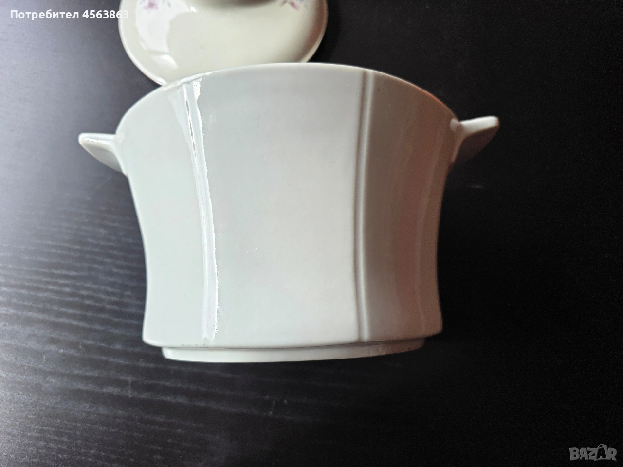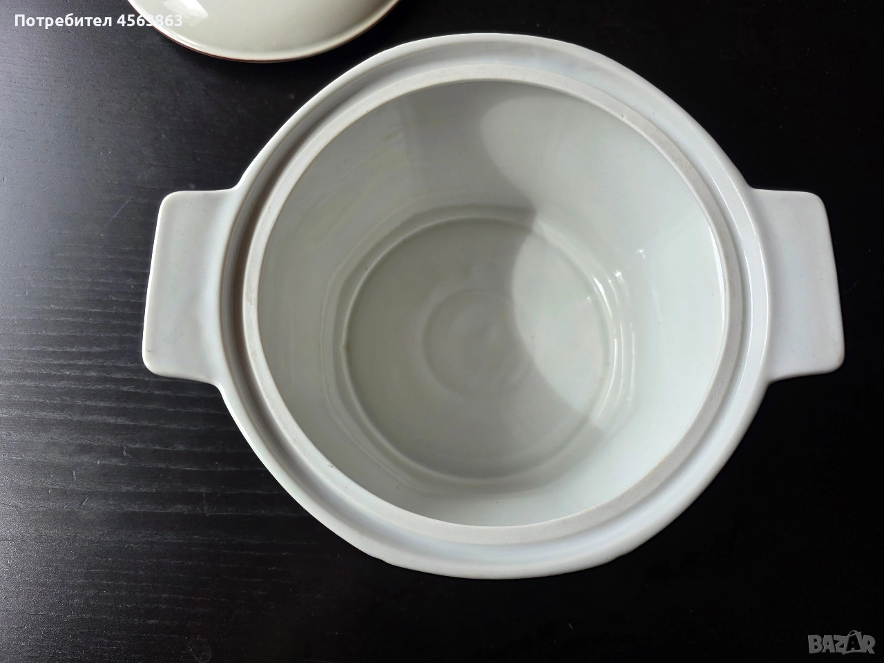 Супник без капак и капак без супник. Супникът е безупречен, чисто бял, с височина 13см и диаметър като капака, на цена 8€. Капакът е с две чипчета и захабявяне от обратната страна, с кафяв кант и външен диаметър 20,5см, а вътрешен 17 см на цена 2€