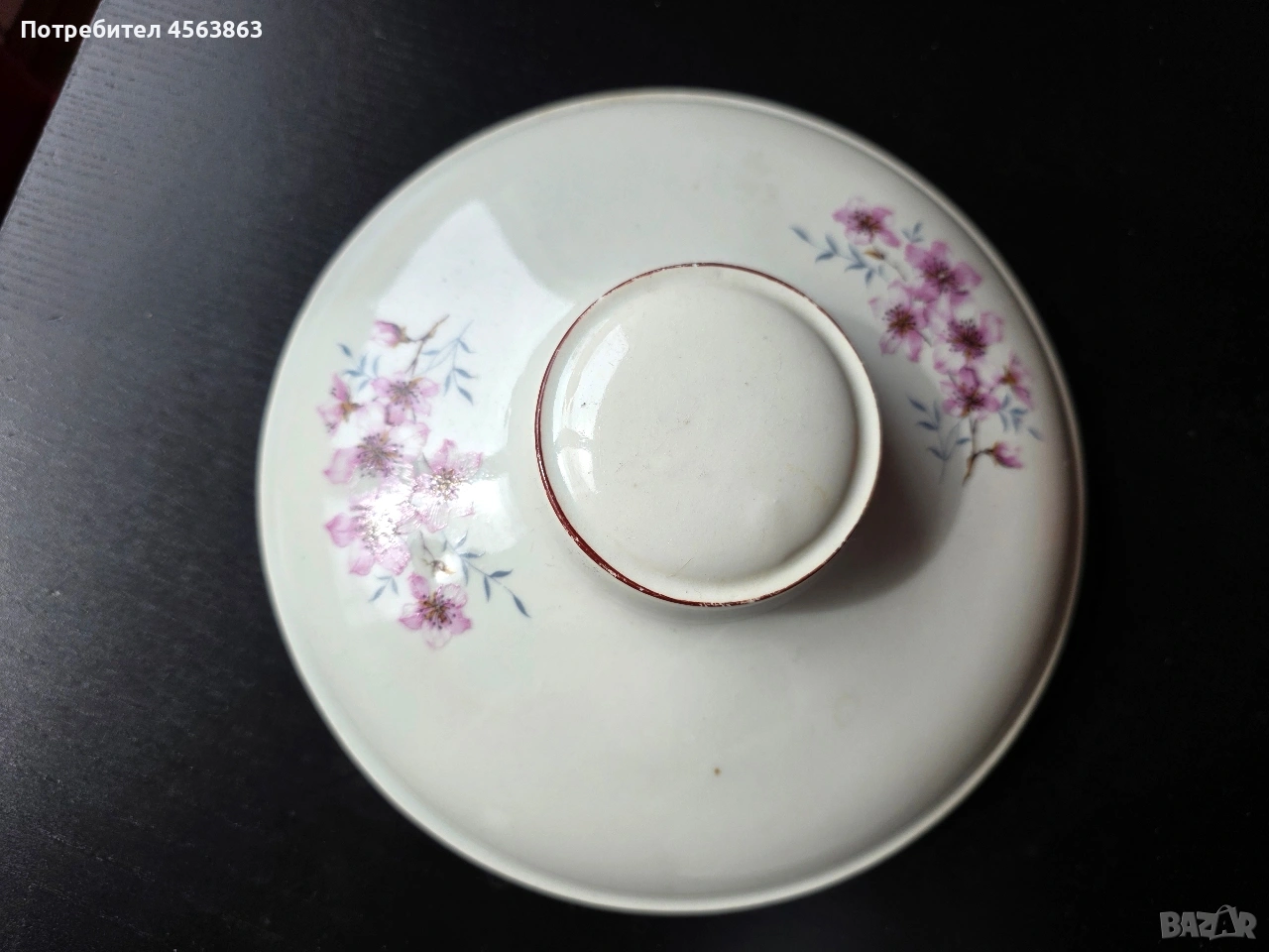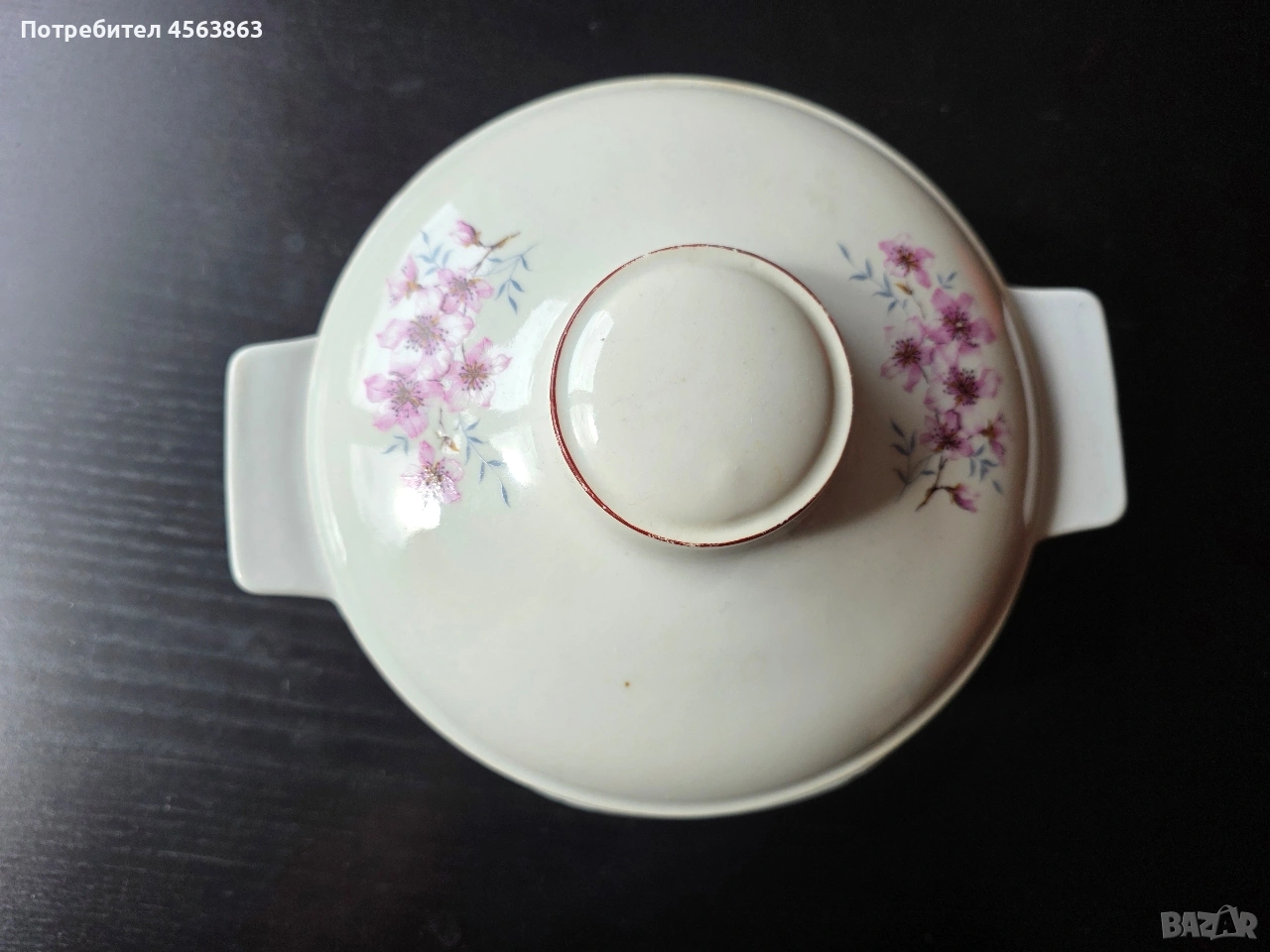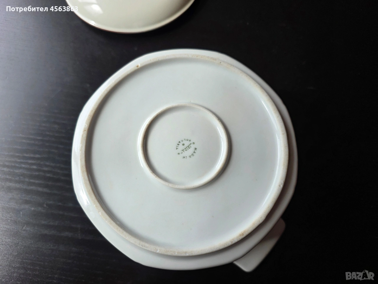 Супник без капак и капак без супник. Супникът е безупречен, чисто бял, с височина 13см и диаметър като капака, на цена 8€. Капакът е с две чипчета и захабявяне от обратната страна, с кафяв кант и външен диаметър 20,5см, а вътрешен 17 см на цена 2€