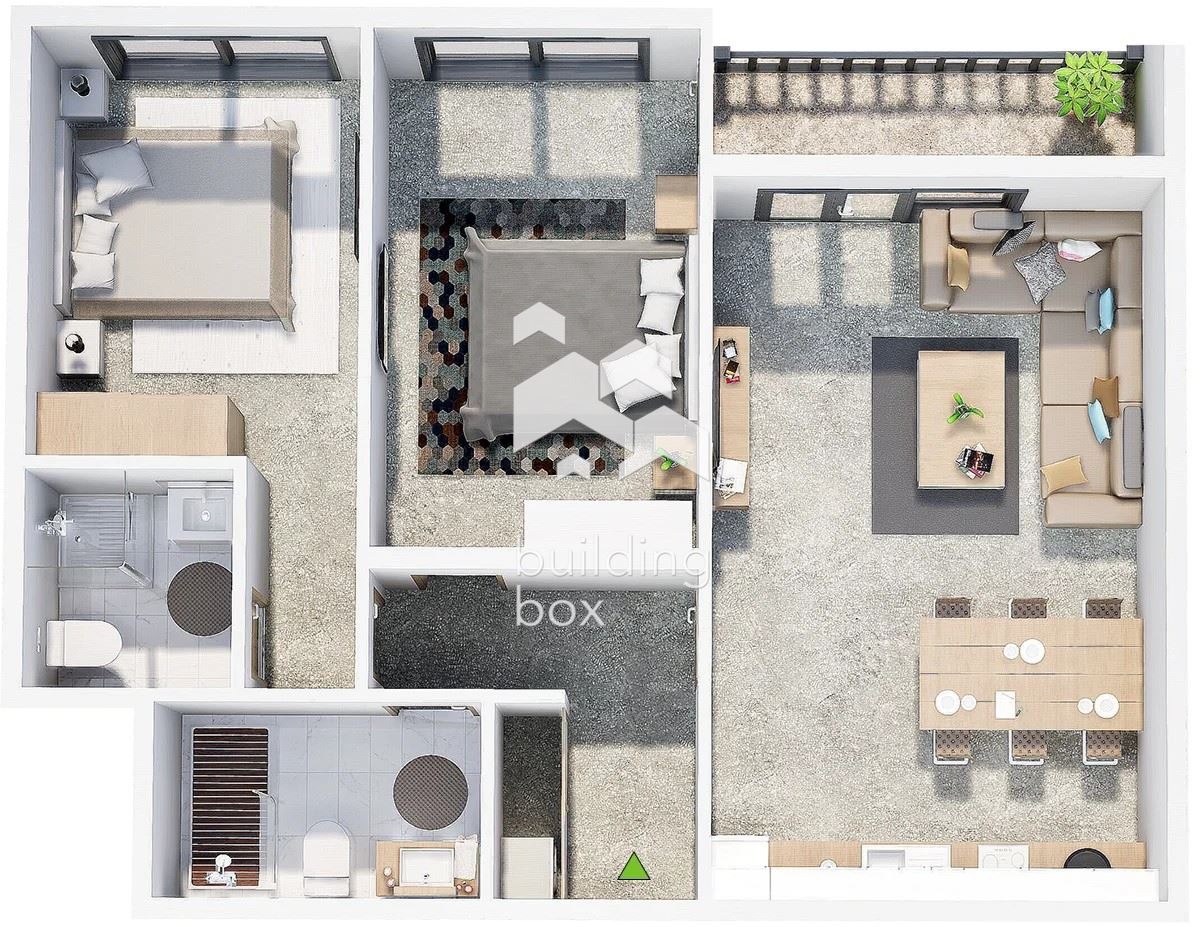- РАЗПРЕДЕЛЕНИЕ: Просторна всекидневна с кухненски бокс с площ от 27,46 кв.м, две спални, две бани с тоалетни, антре и тераса.