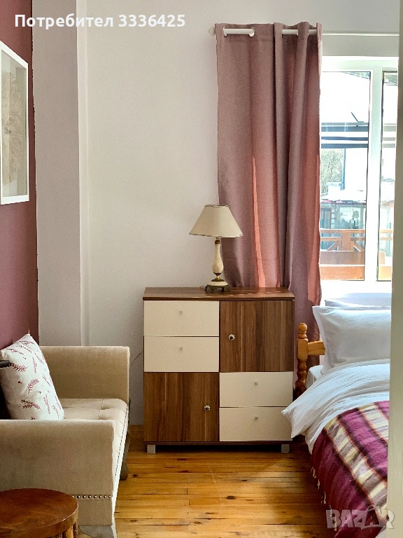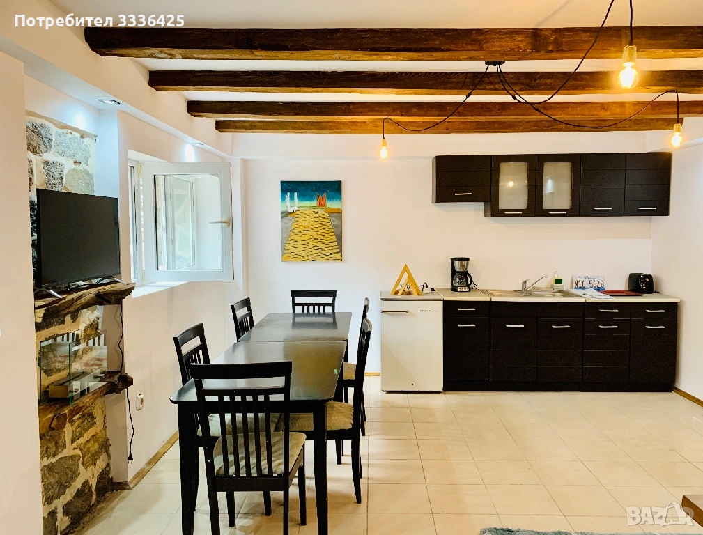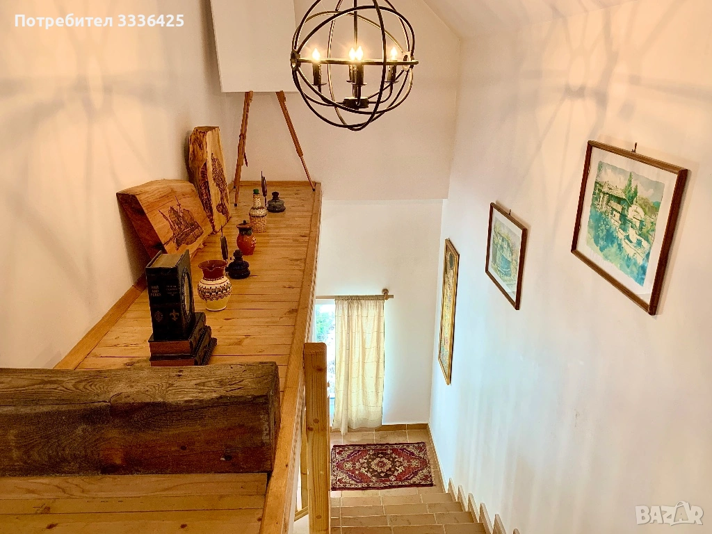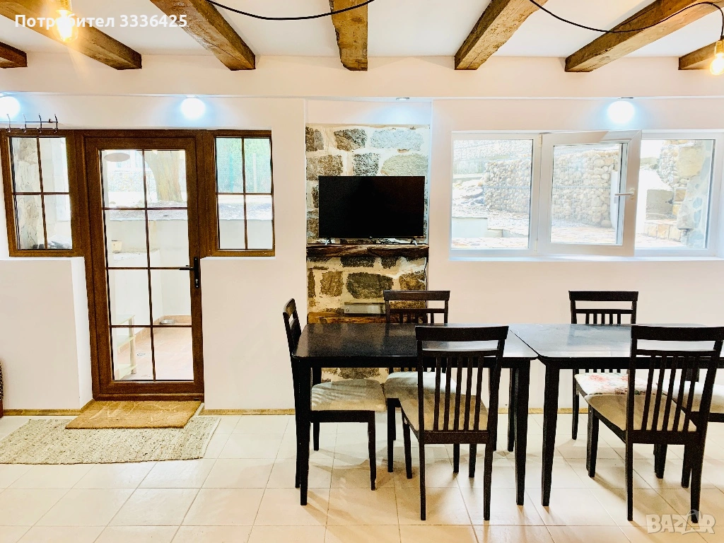 Първи етаж - отворен план дневна с кухня и трапезария, излаз към голяма веранда, спалня с баня с тоалетна и вана;