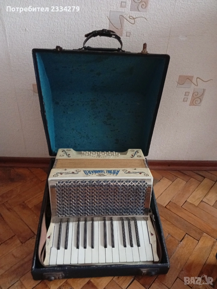 Стара класическа акустична китара ,, ОРФЕЙ" произведена в гр.Пловдив 1970година. N:2 стар немски акордеон, много добре запазен,свирещ комплектен с кутия, изработен в Майнхайм Германия 40-50те години, има и табелка, цена 70€.