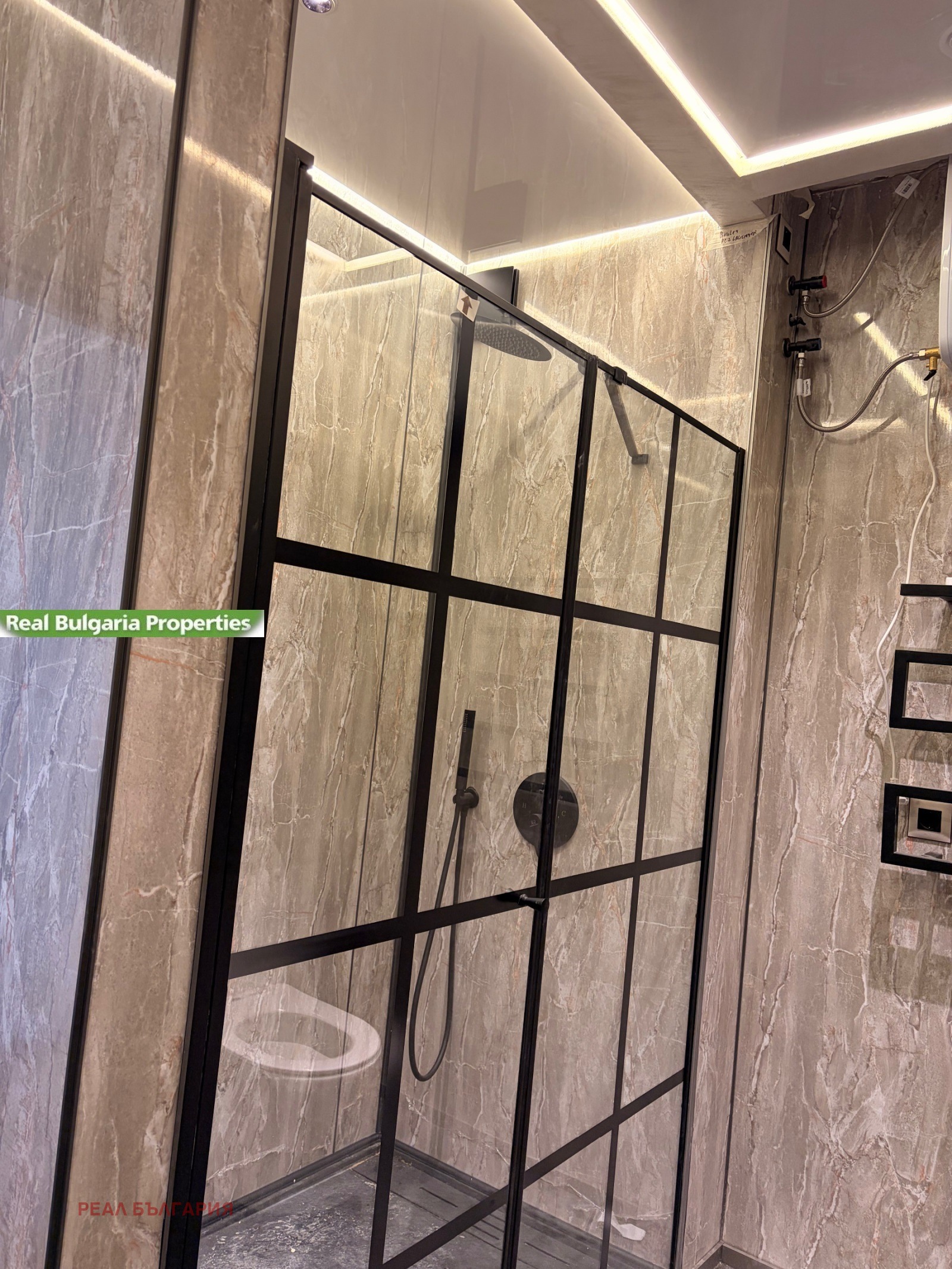 Банята е оборудвана с душ кабина, душ батерия, вградена тоалетна, умивалник, огледало, шкафчета и различни аксесоари. Дизайнът е стилен и съчетава елементи от мрамор и метал, което придава на банята изтънчен и съвременен вид.