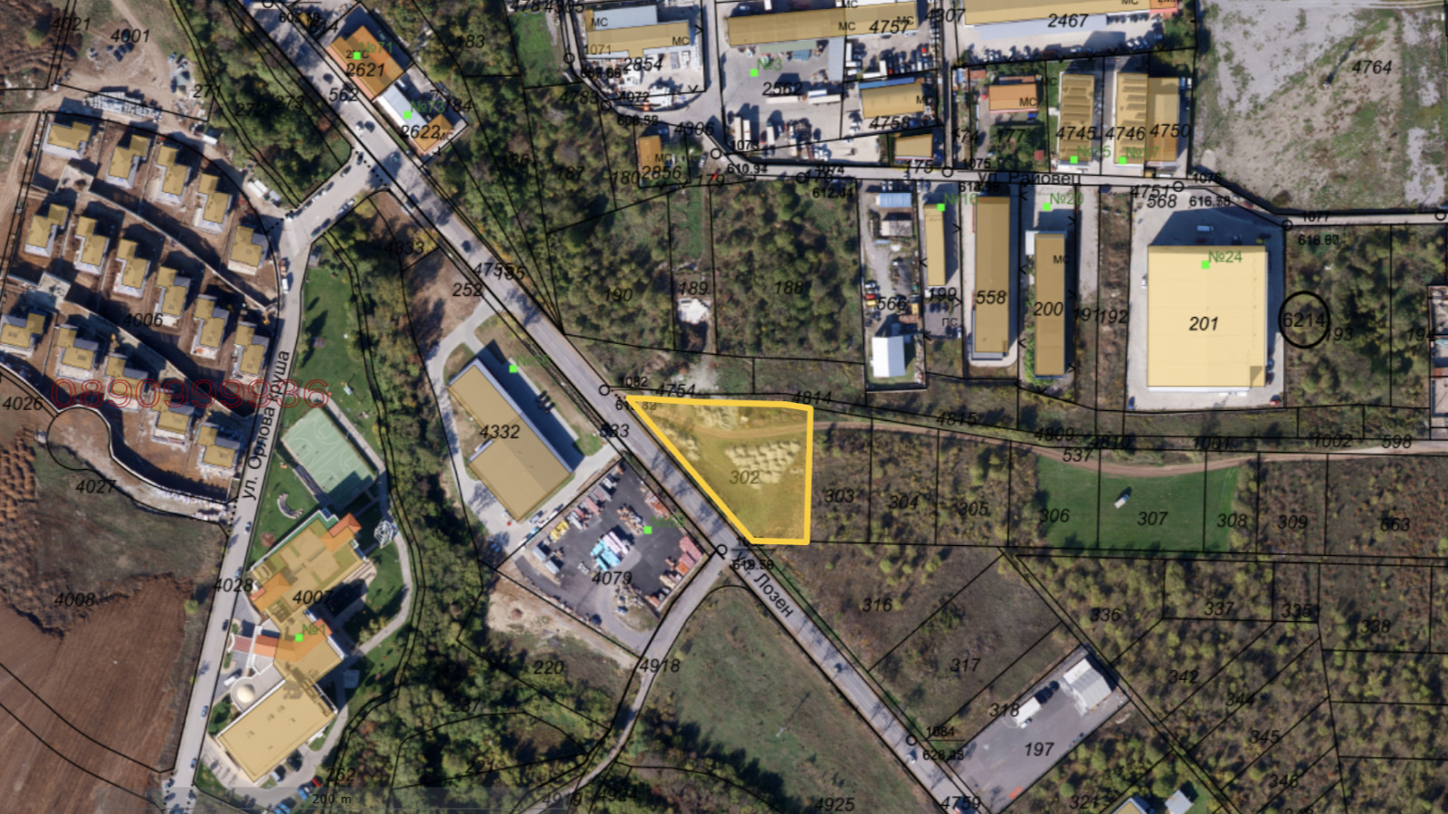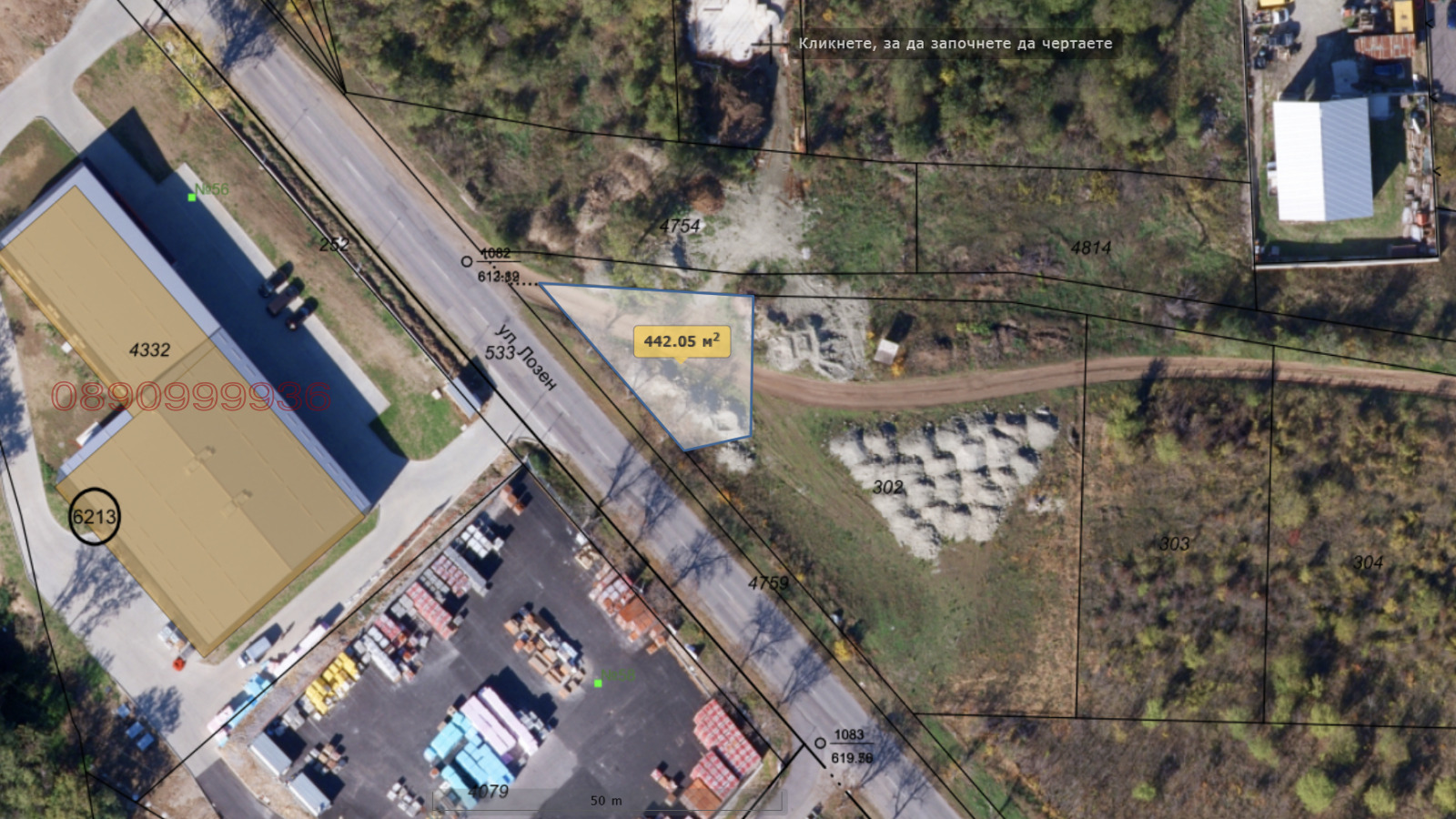 Ъглов парцел на главна улица и почвен път.