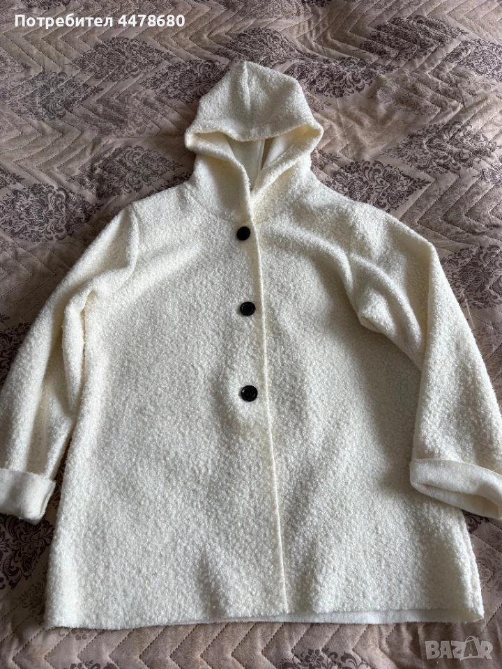 Нова, неупотребявана, стилна връхна дреха – тип палто/жилетка от от мека и приятна на допир материя. Закопчава се с копчета, със свободна кройка и качулка.