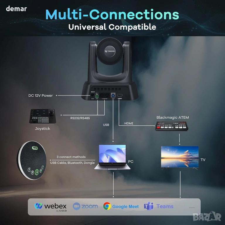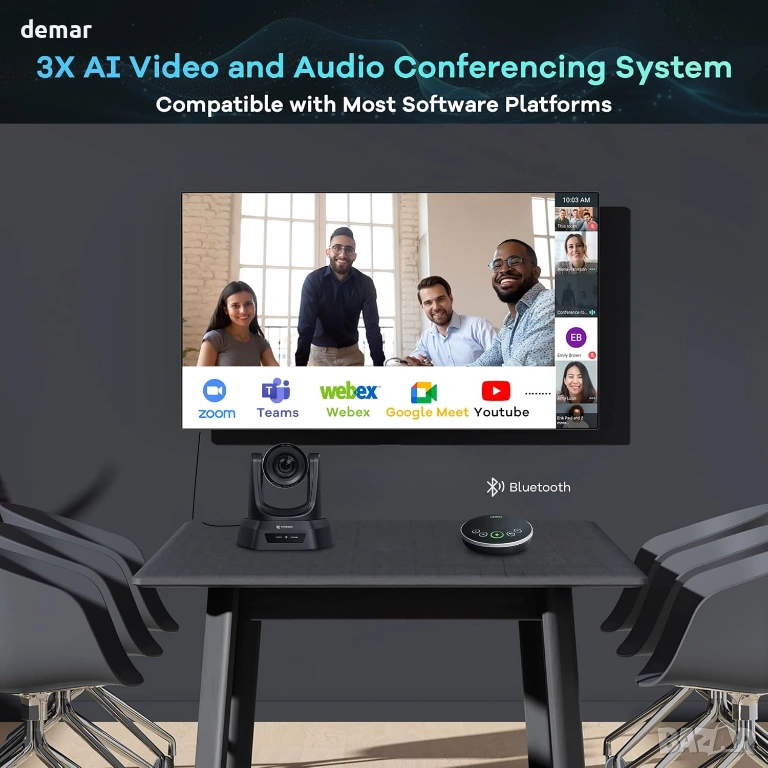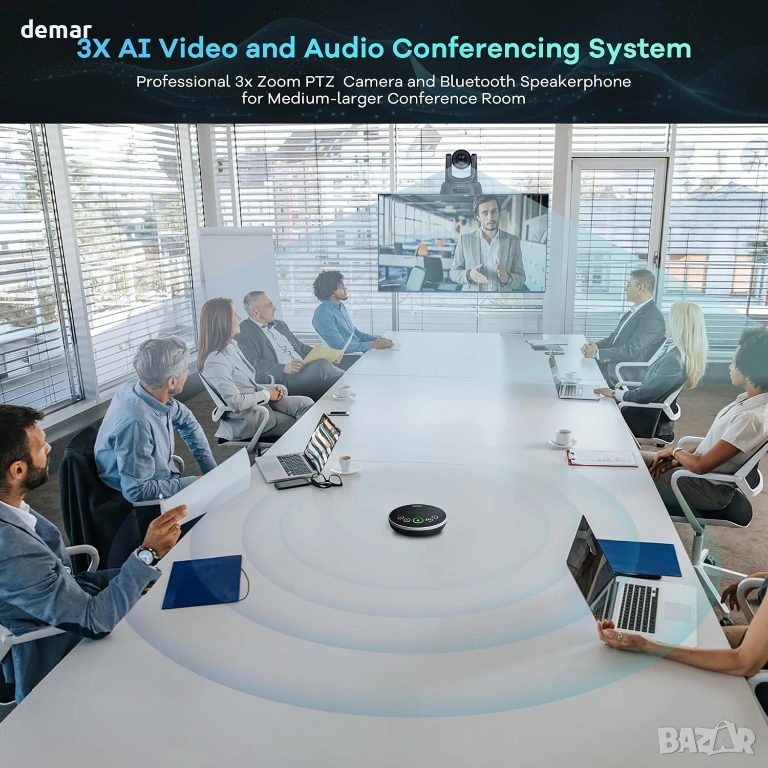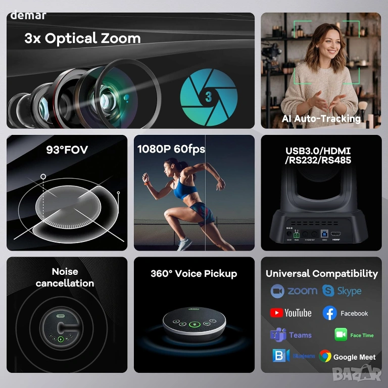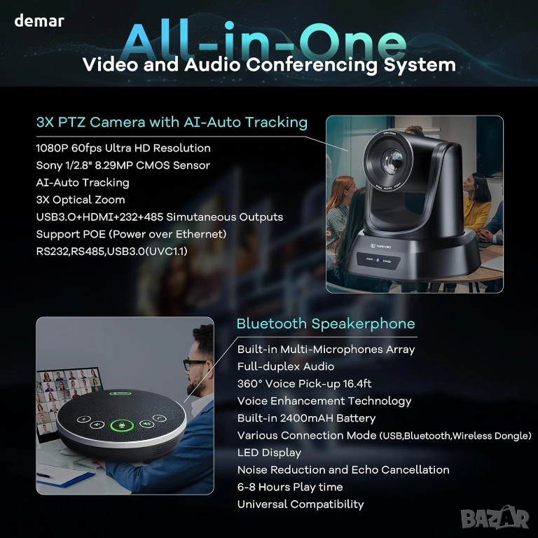 Многофункционална конферентна система, включваща PTZ камера с автоматично проследяване, задвижвана от изкуствен интелект, която интелигентно следва активните говорители с регулируеми контроли за движение за плавна работа без ръце. Тя предоставя ясно Full HD видео, заедно с Bluetooth високоговорител с всепосочен микрофон и пълнодуплексен звук, осигурявайки естествена комуникация за малки до средни групи. Системата поддържа множество опции за свързване, включително USB, HDMI, Bluetooth и безжичен адаптер, с вградена батерия за продължителна употреба. Проектирана за удобство, тя предлага истинска plug-and-play настройка без нужда от драйвери и работи безпроблемно в основни операционни системи и популярни платформи за конферентни разговори, което я прави подходяща за срещи, онлайн обучение, стрийминг на живо и професионални презентации.