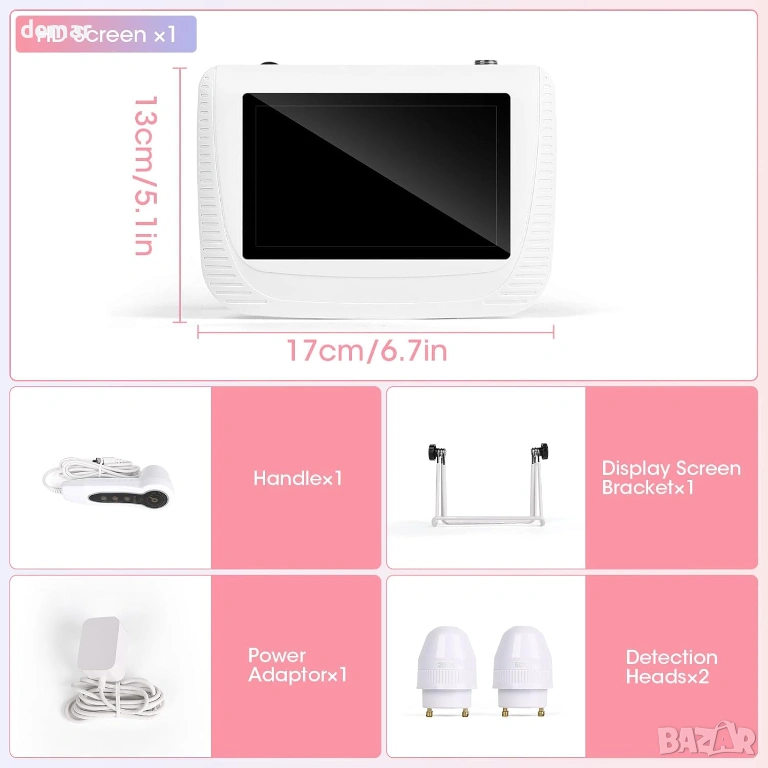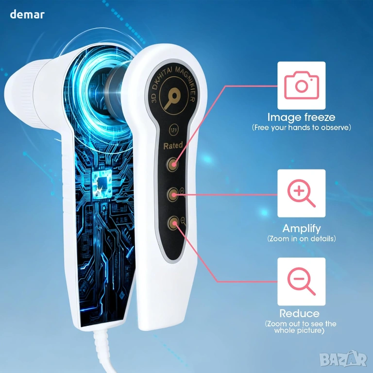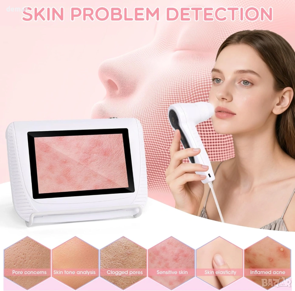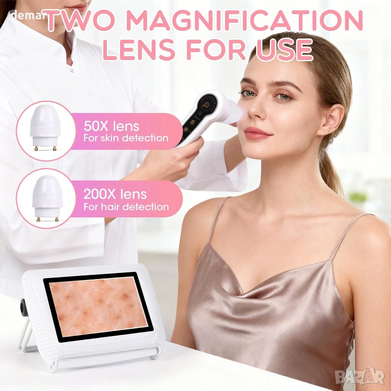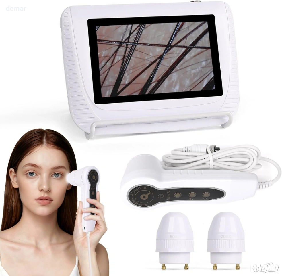 Този дигитален анализатор на кожа и коса разполага с лещи с двойно увеличение (50X за повърхностно наблюдение и 200X за детайлно изследване на скалпа и фоликулите), комбинирани с вграден 5-инчов HD дисплей за ясна графика в реално време, без да е необходимо използване на външни устройства. Той позволява на потребителите лесно да наблюдават текстурата на кожата, хидратацията, нивата на омазняване и състоянието на косата, докато функциите за замразяване на кадъра и мащабиране помагат за детайлно заснемане и преглед на специфични области. Проектиран както за салонна, така и за лична употреба, той предлага лека и лесна за употреба конфигурация за бърза работа и ефективен анализ отблизо на кожата и скалпа.