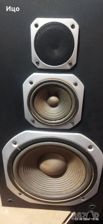 Швейцарски тонколони с 10" бас.Данните от снимките.Отлична звукова характеристика 33-22000Hz.Всички говорители работят.Плътен бас,ясни и отчетливи високи.Добър външен вид без ожулвания.Налични бленди,с леки прокъсвания на плата.Размери.60/35/28 в см.