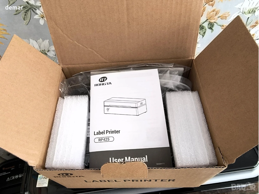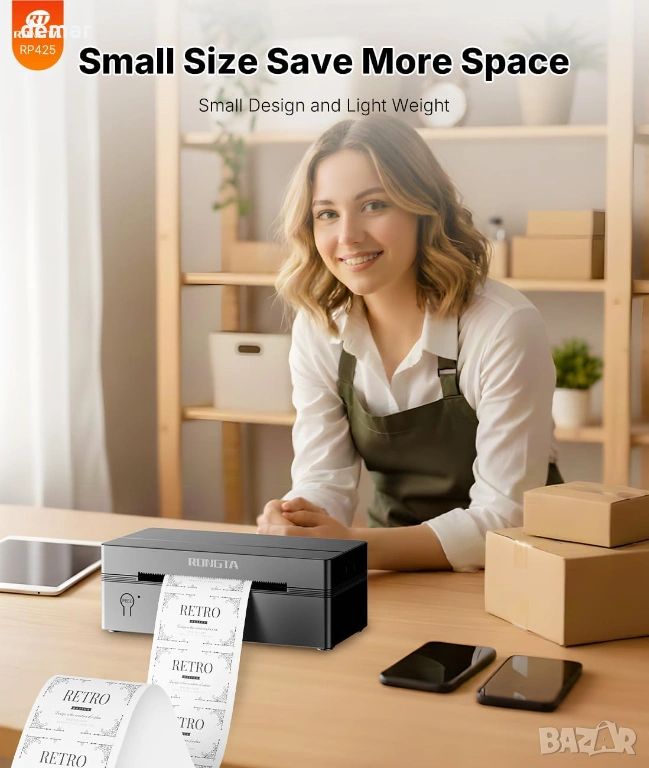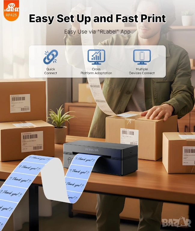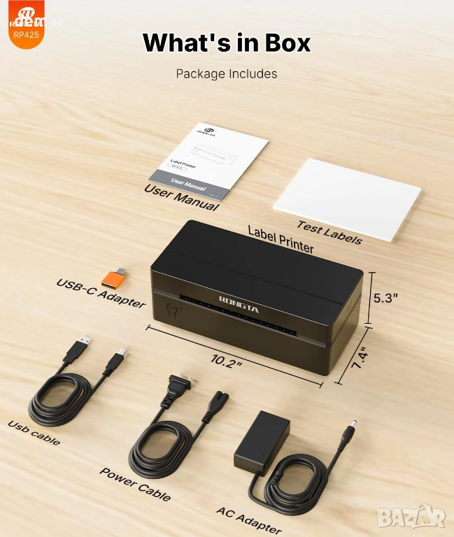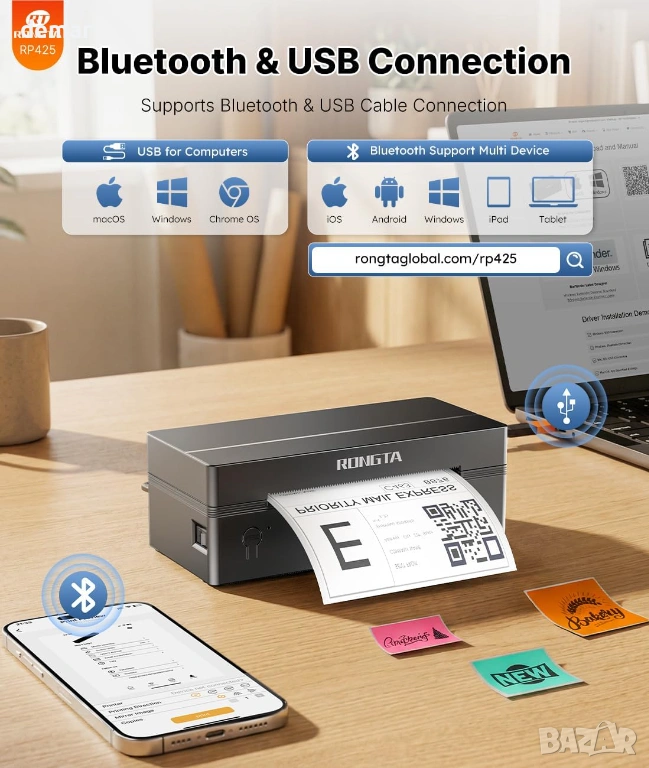 Термален принтер за етикети Rongta RP425 с Bluetooth и USB свързване, подходящ за печат на товарителници и адресни етикети 4x6. Работи с мобилно приложение „Rlabel“ за iOS и Android, като позволява лесно свързване и директен печат от телефон или таблет чрез Bluetooth. Може да се използва и с компютър чрез USB, съвместим с Windows, Mac и Chrome. Отличава се с бърз печат до 60 етикета в минута и не изисква мастило или консумативи благодарение на директната термална технология. Поддържа автоматично разпознаване на етикети с ширина от 4 до 10 см, подходящ за куриерски услуги и онлайн магазини. Подходящ за бизнес употреба, складове и онлайн търговия. В комплекта са включени принтер, ръководство, инструкция и Type-C адаптер. Отлично състояние и готов за работа.