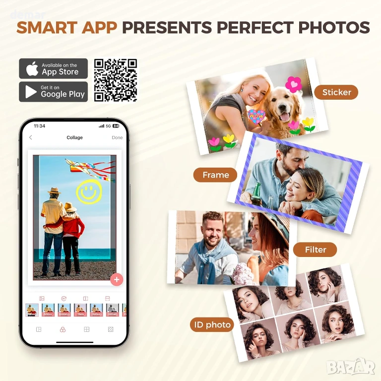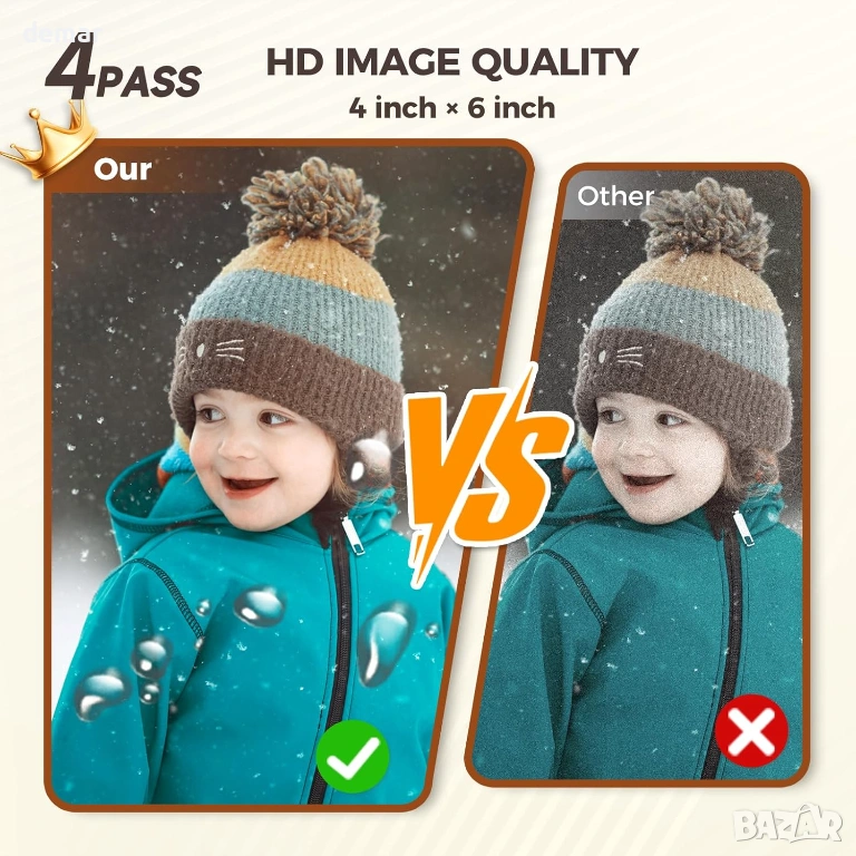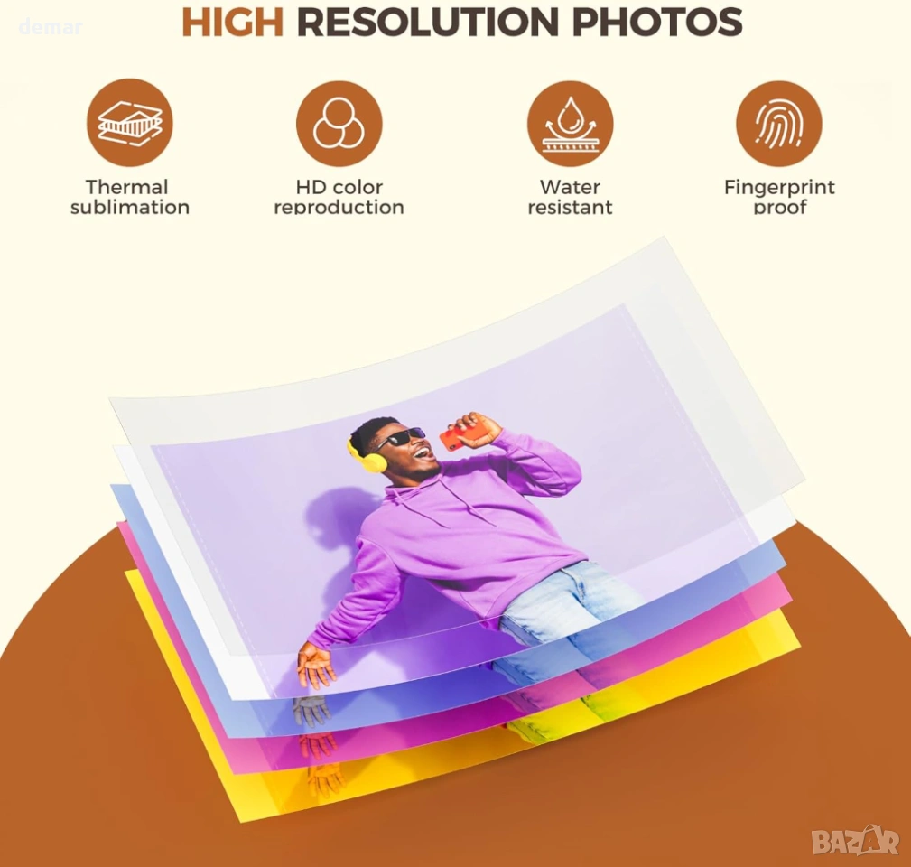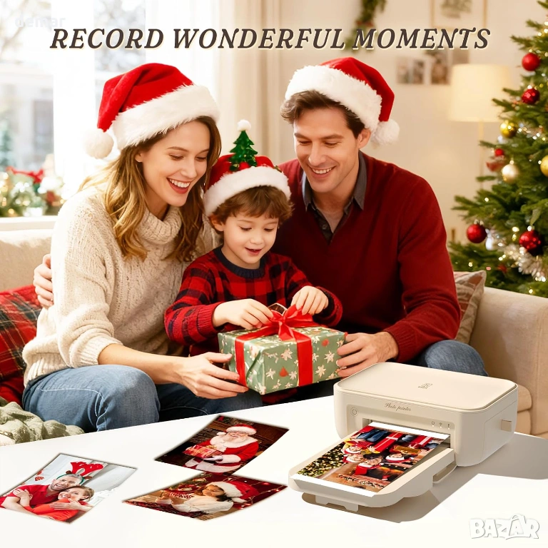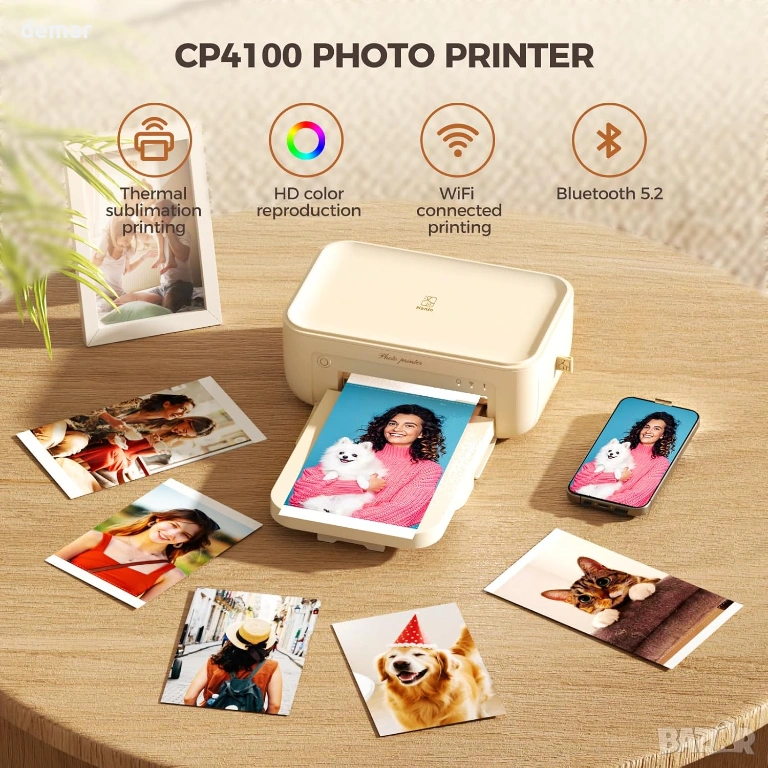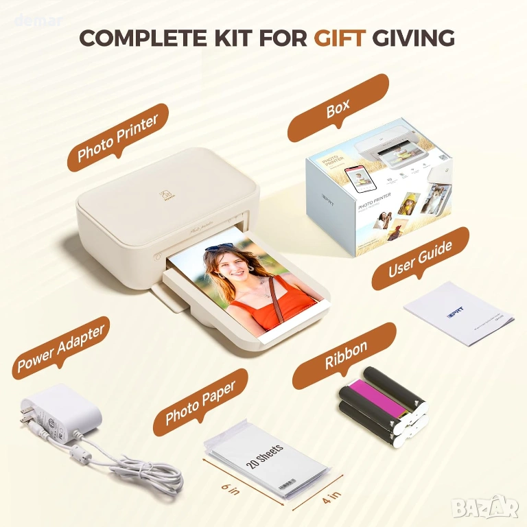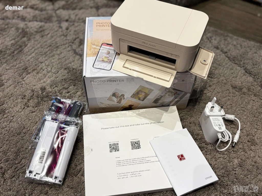 Фото принтер 4x6 с WiFi, подходящ за директен печат на снимки от телефон. Работи с термосублимационна технология без мастило и осигурява високо качество с наситени цветове и 300 dpi резолюция. Всяка снимка се покрива със защитен слой, който я предпазва от вода, прах, мазнини и отпечатъци, което гарантира дълготрайност без избледняване. Принтерът се свързва лесно чрез WiFi и мобилно приложение, без нужда от загряване и без проблеми при печат. Компактен и удобен за пренасяне, позволява печат на до 18 снимки последователно, като една снимка се отпечатва за около 90 секунди. Подходящ за семейни снимки, пътувания и подарък за различни поводи. В комплекта са включени 108 листа фото хартия 4x6, 2 рибън касети, захранващ адаптер и ръководство. Отлично състояние, готов за ползване.