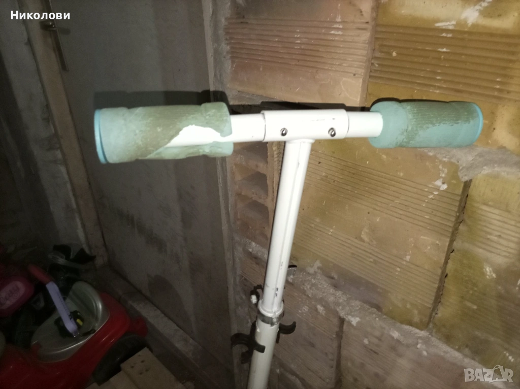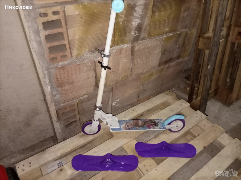 Много яко ползвана тротинетка. Забележка само по ръкохватките. В комплект с чисто нови ски които може да се сложат на мястото на колелетата. Максимална височина на дръжките 82 см