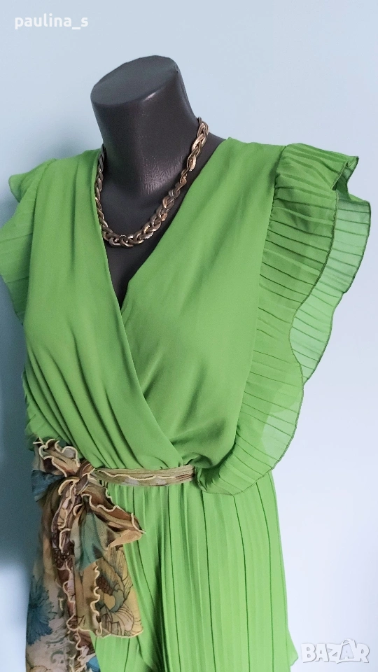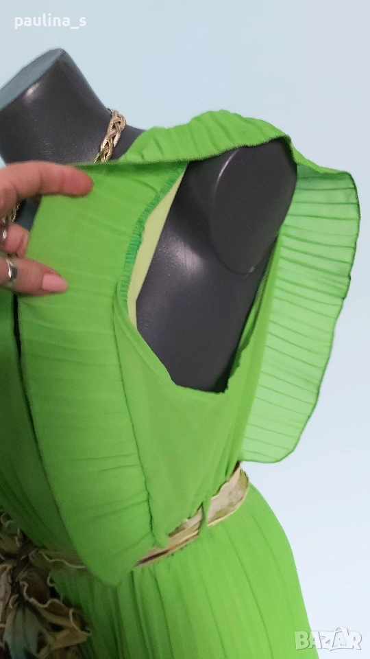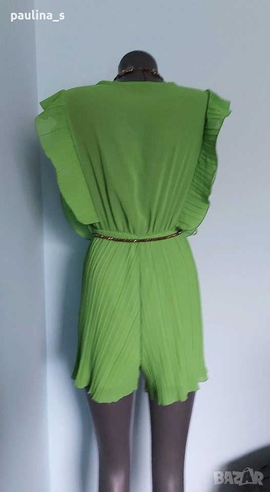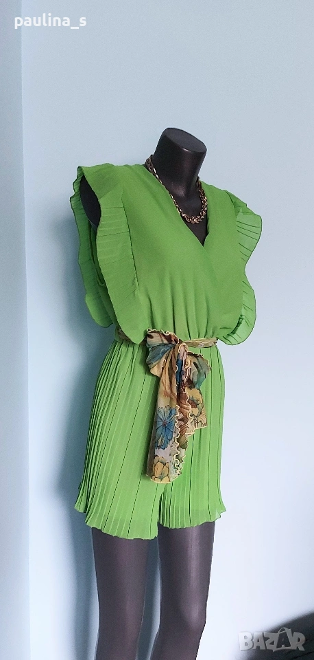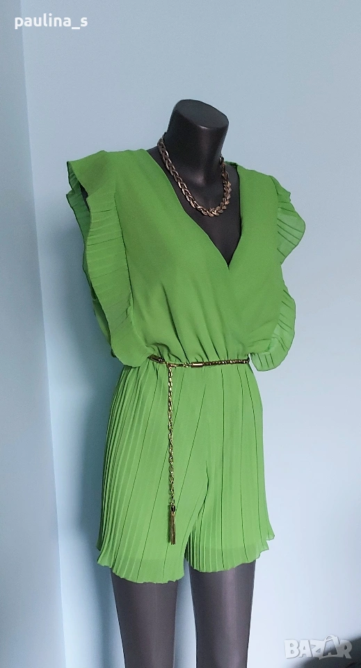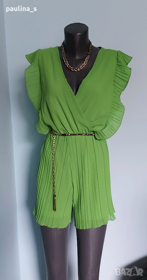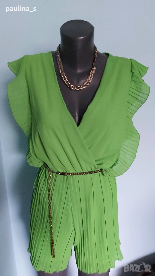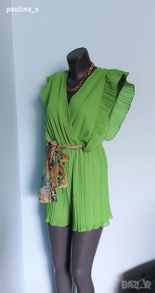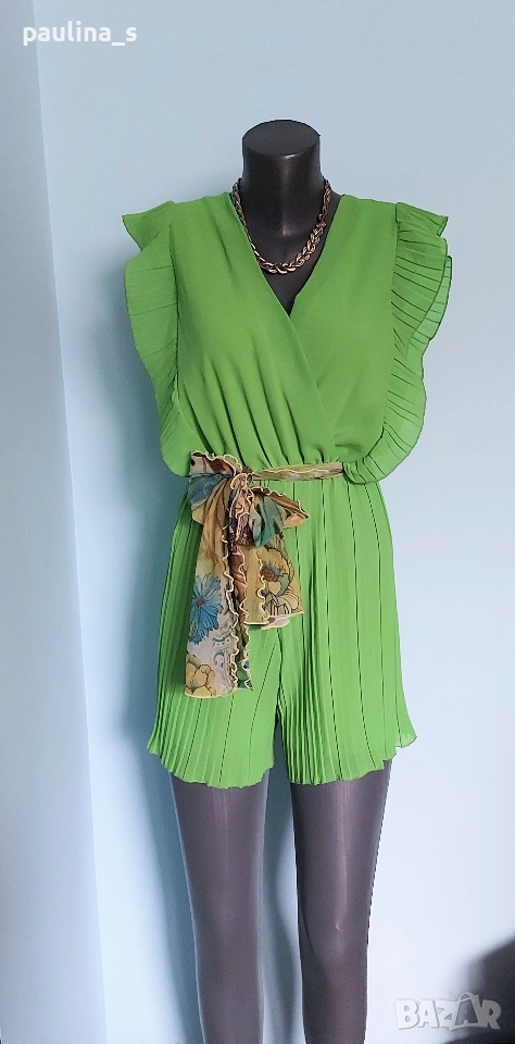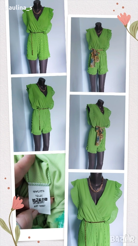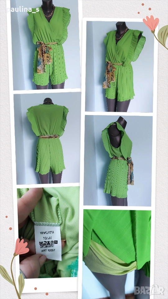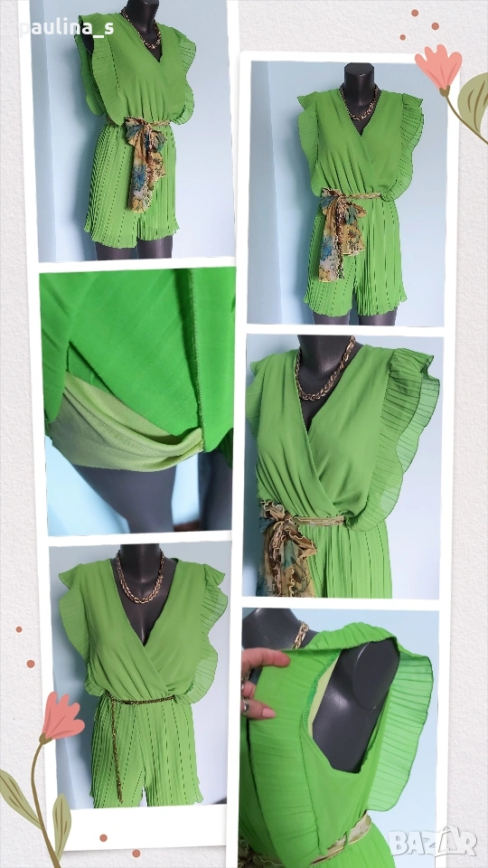 1️⃣. Колаж / S / XL - Италиански гащеризон с крилца и шорти солей. Цената е крайна, без пазарлъци 20 евро! Неоново зелен цвят дамски гащеризон, с прихлупване в горната част, талията е на ластик, има подплата на необходимите места. Материята е шифон с лека прозрачност, стои превъзходно. Коланите са примерни, шареният е подарък. Без дефекти и етикет, чисто нов е, без колан.