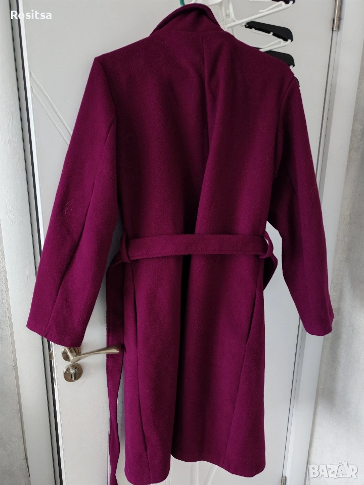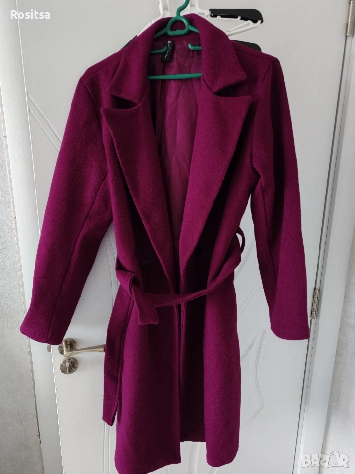 Продавам палто - изполвано, винен цвят, с хастар, копчета и колан. Дължина 100 см, ширина 100 см (закопчано само с копчето), дължина на ръкава - 60 см. Размер М.