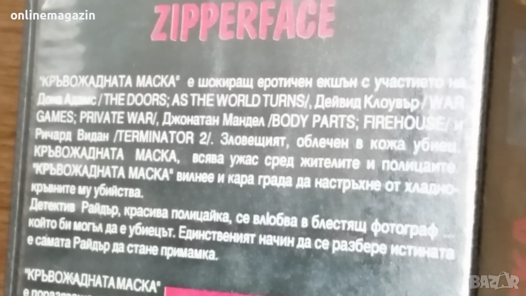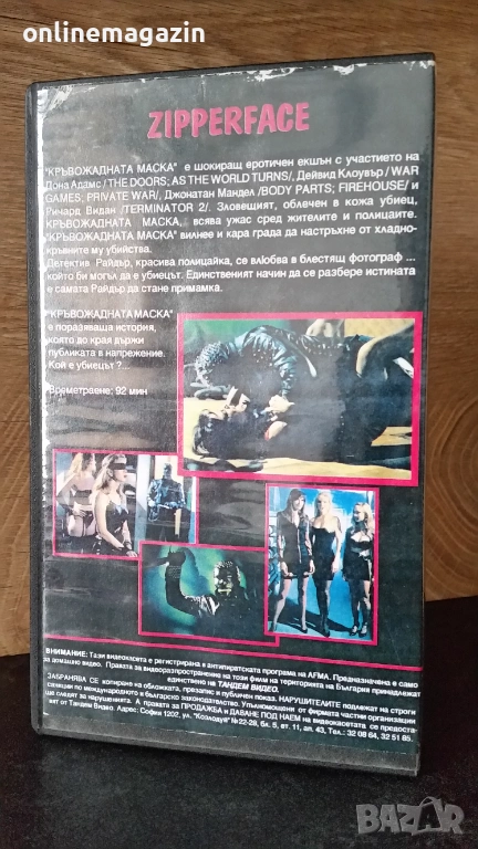 Продавам рядък филм на TANDEM VIDEO КРЪВОЖАДНАТА МАСКА. ( ZIPPERFACE ) Жанр: Еротичен-Ужас . Времетраене : 92 минути ( 1 ч. и 32 минути ) 1992 година. Филмът е озвучен на български език от мъжки и женски глас . Касетата работи отлично . 5 снимки на касетата в работещо състояние . Изпращам с Еконт, Спиди или лично предаване .