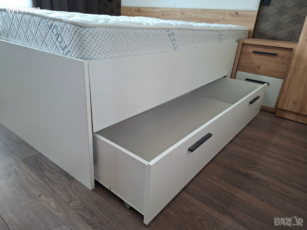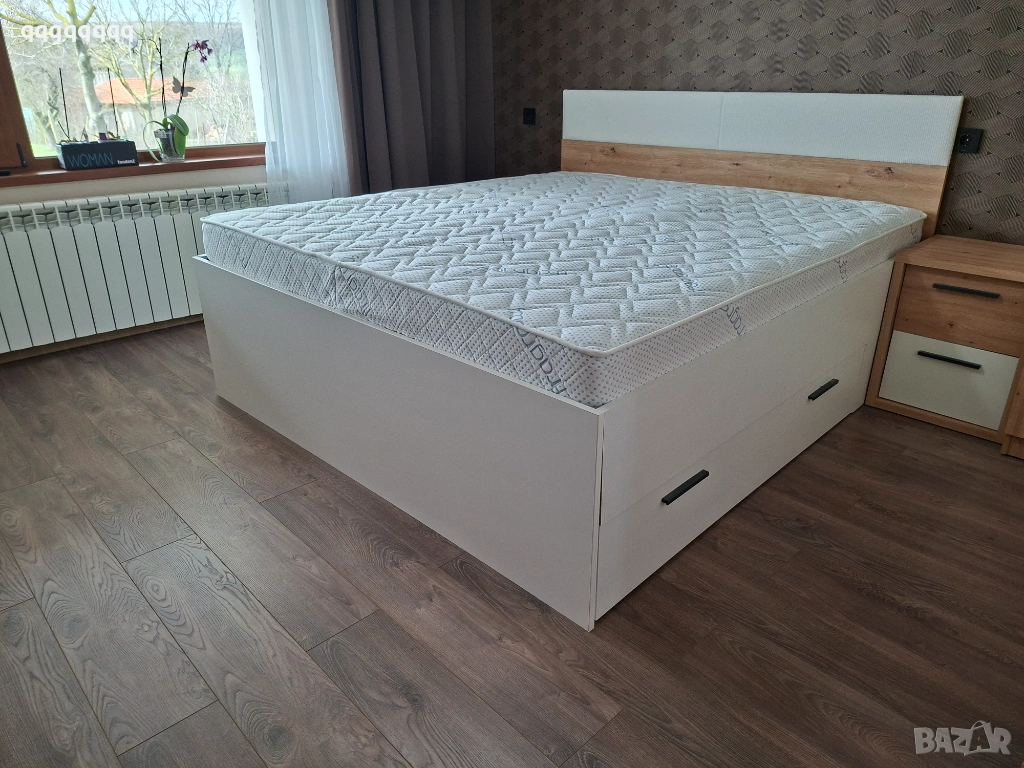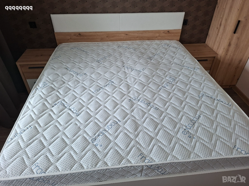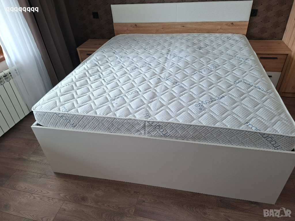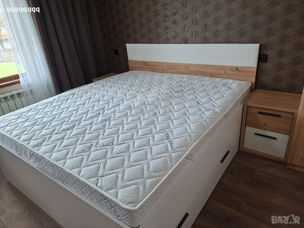 Спалня с двулицев матрак от мемори пяна с размери 180/200см.С две подматрачни ракли. Към спалнята има и два броя нощни шкафчета. Купуван от Momax на цена от 900евро!!! Крайна цена-700€ !!!