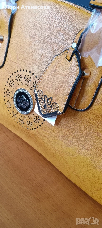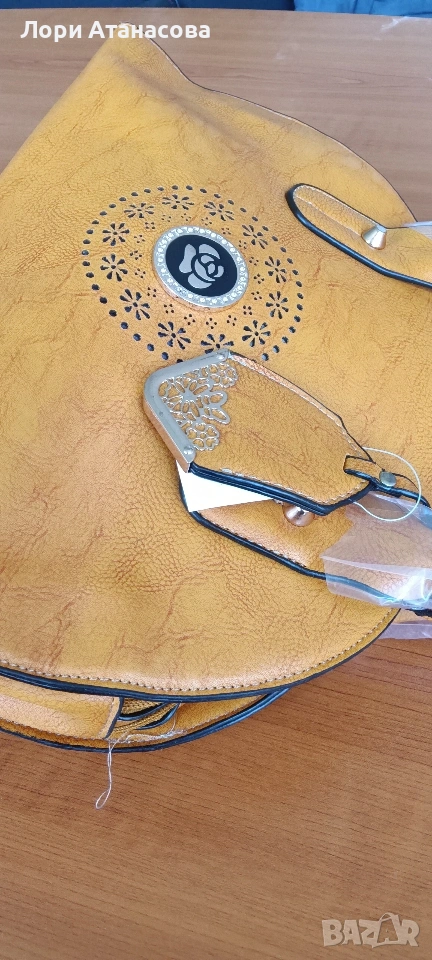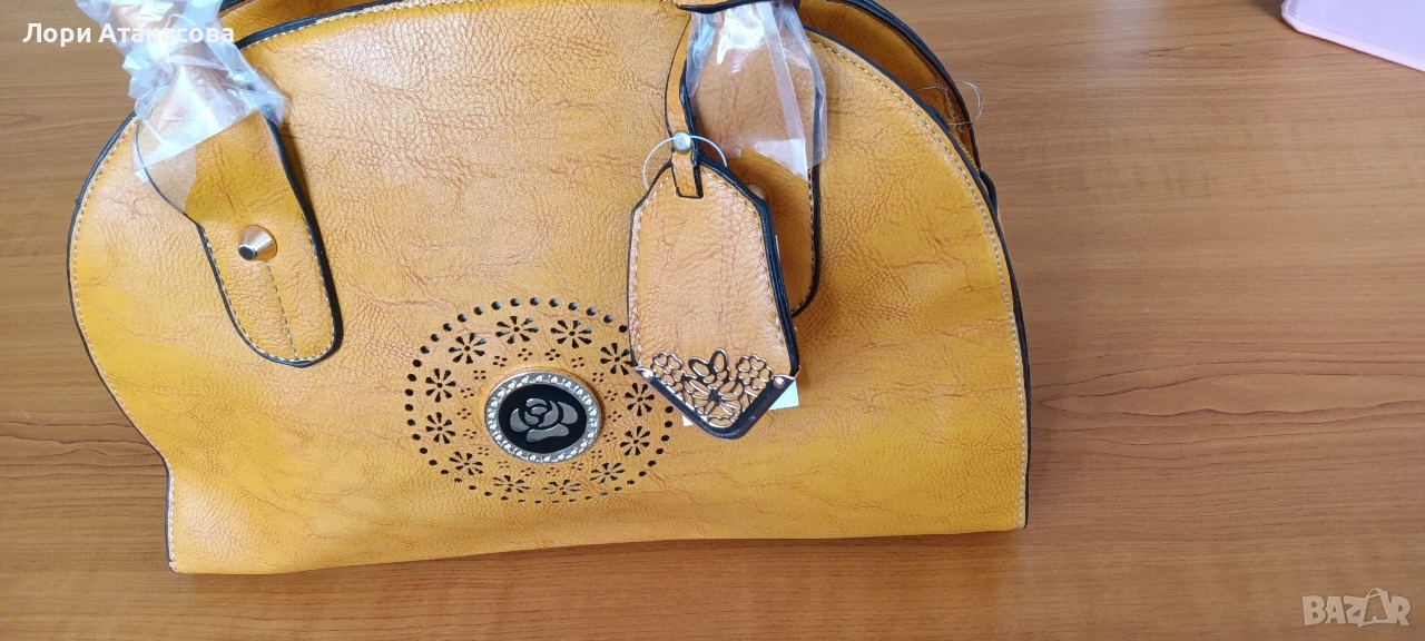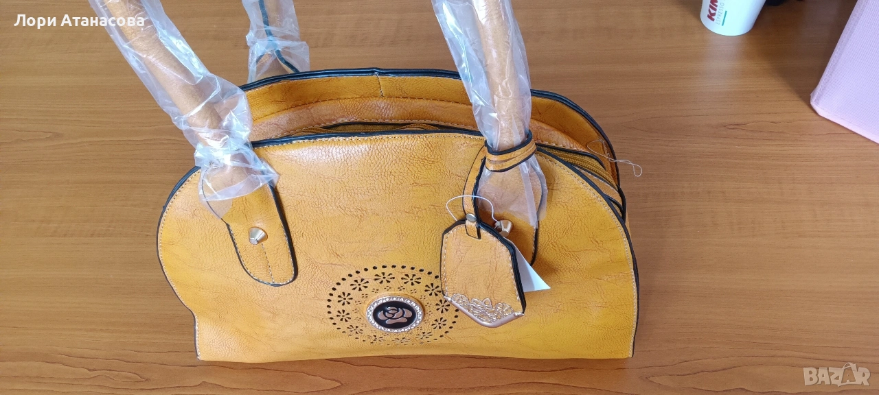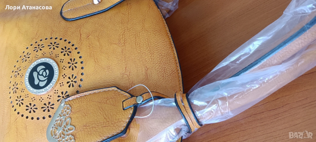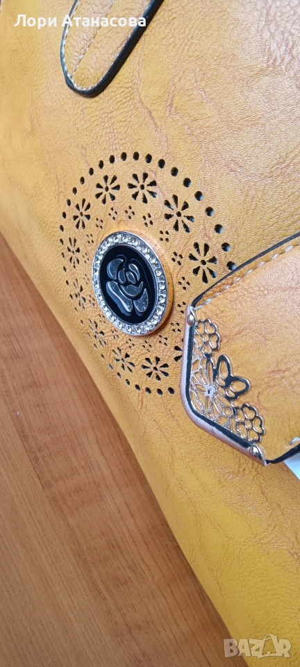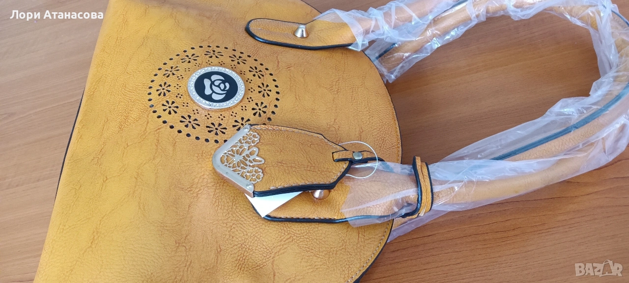 Чанта от висококачествена еко кожа в цвят горчица, с удължаваща се дръжка. Чантата е с три отделения, като средното се затваря с цип. Има един малък вътрешен джоб с цип и отделение за телефон