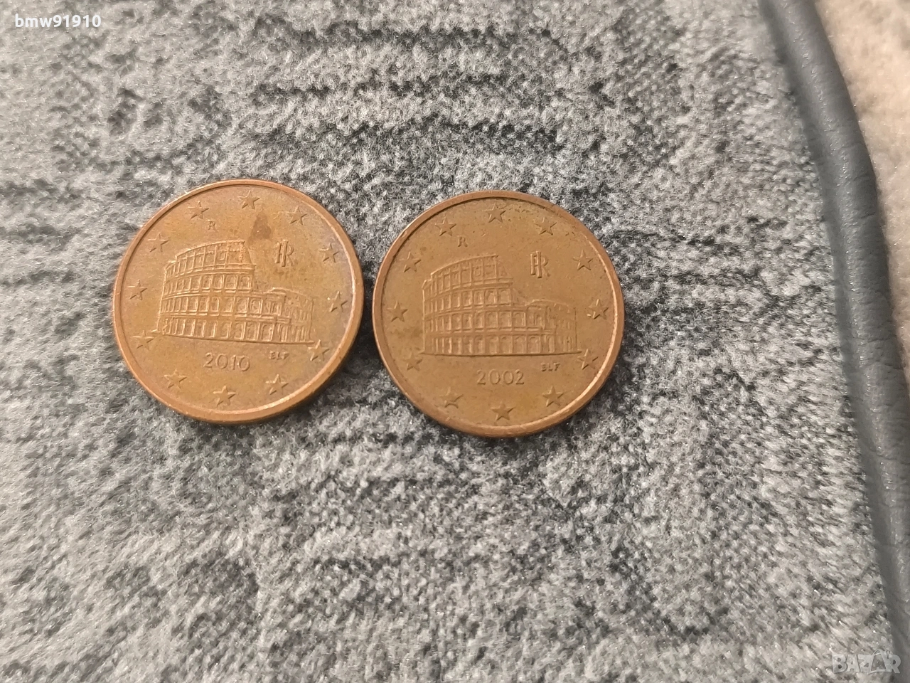 Това е монета от 5 евроцента от Италия, сечена през 2002 и 2010 година. Изображение: На гърба на монетата е изобразен амфитеатърът Колизеум в Рим. Материал: Стомана, покрита с мед.