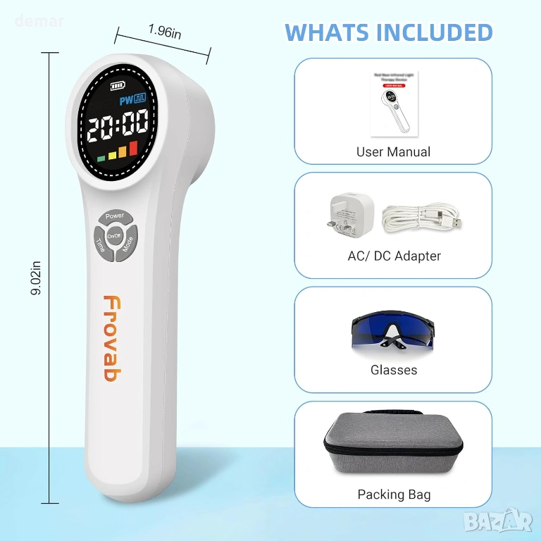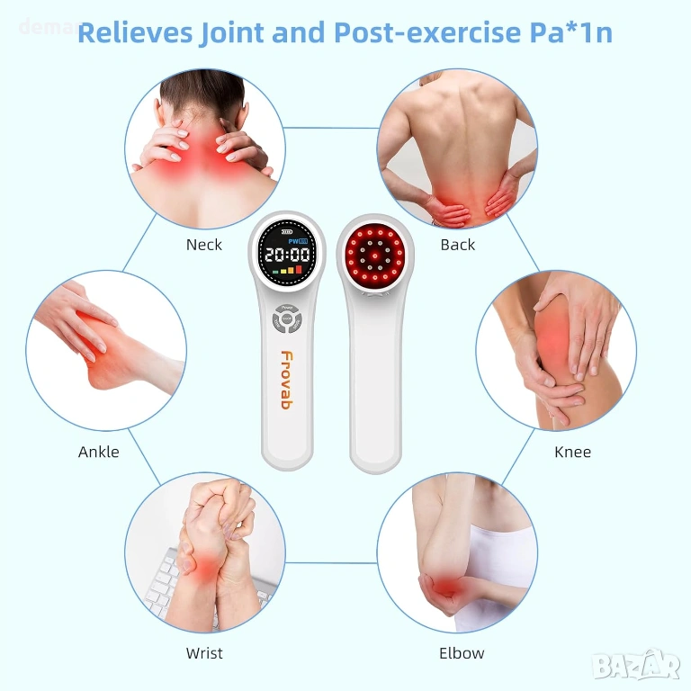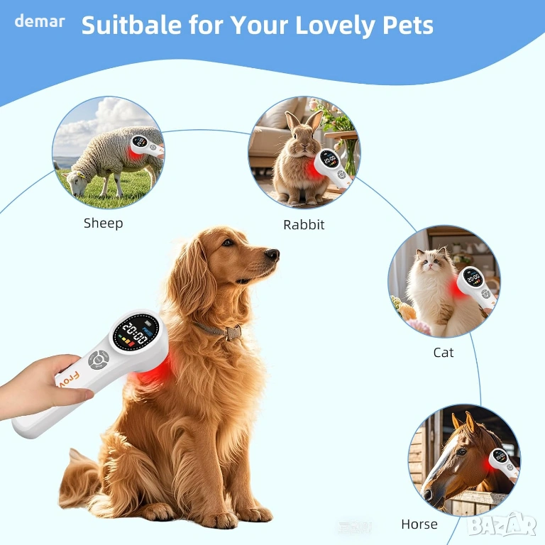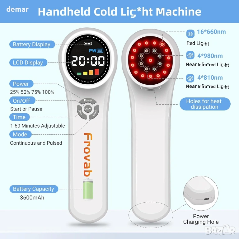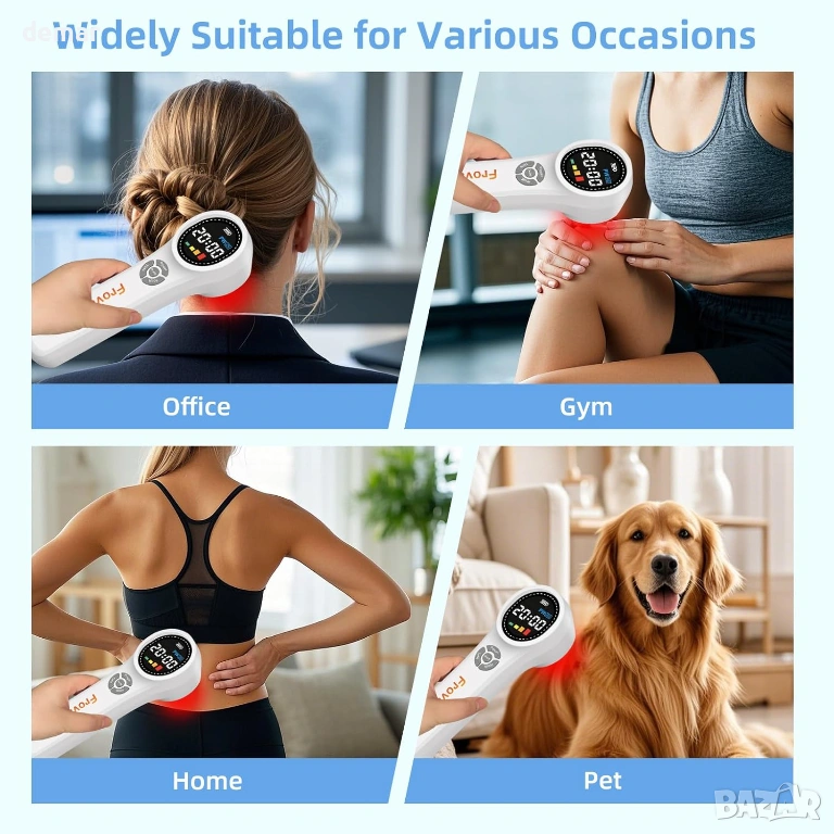 Това преносимо устройство за светлинна терапия разполага с 24 светодиода, комбиниращи три дължини на вълната (660nm, 810nm, 980nm), предназначени да въздействат върху повърхностните и по-дълбоките мускулни слоеве за релаксация и облекчаване на болката. Включва цветен LCD дисплей с регулируеми нива на мощност, настройки на таймера от 1 до 60 минути и избираеми непрекъснати или импулсни режими за гъвкава употреба. Компактният и лек дизайн го прави лесен за употреба навсякъде, с до 4,5 часа работа с едно зареждане. Предназначено за директно приложение върху кожата, то е подходящо за ежедневна употреба и е подходящо за облекчаване на дискомфорта в ставите и мускулното напрежение както при хора, така и при домашни любимци. Комплектът включва устройството, адаптер за зареждане, защитни очила и ръководство за потребителя за безопасна и лесна работа.
