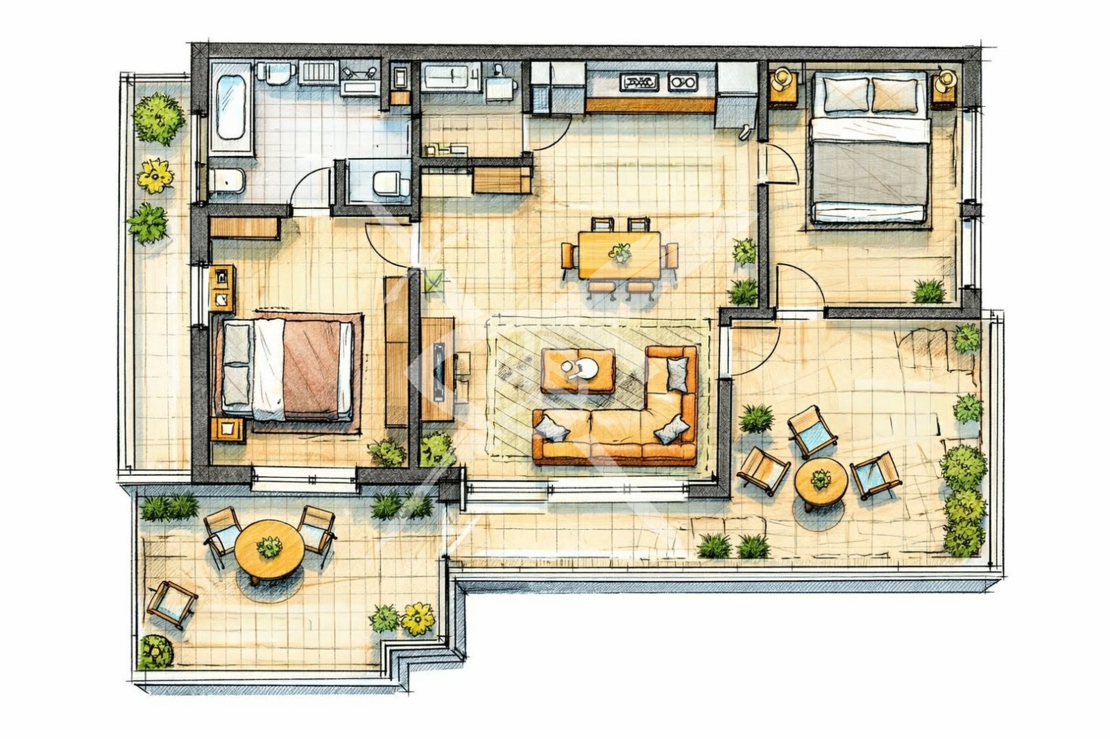РАЗПРЕДЕЛЕНИЕ: Жилището разполага с площ от 80 кв.м. разпределен във входно антре, хол с трапезария кухненски бокс, две спални, баня с тоалетна, отделна тоалетна и две тераси.