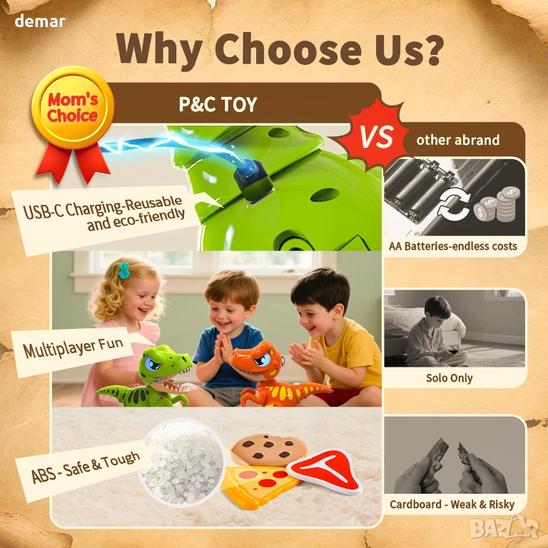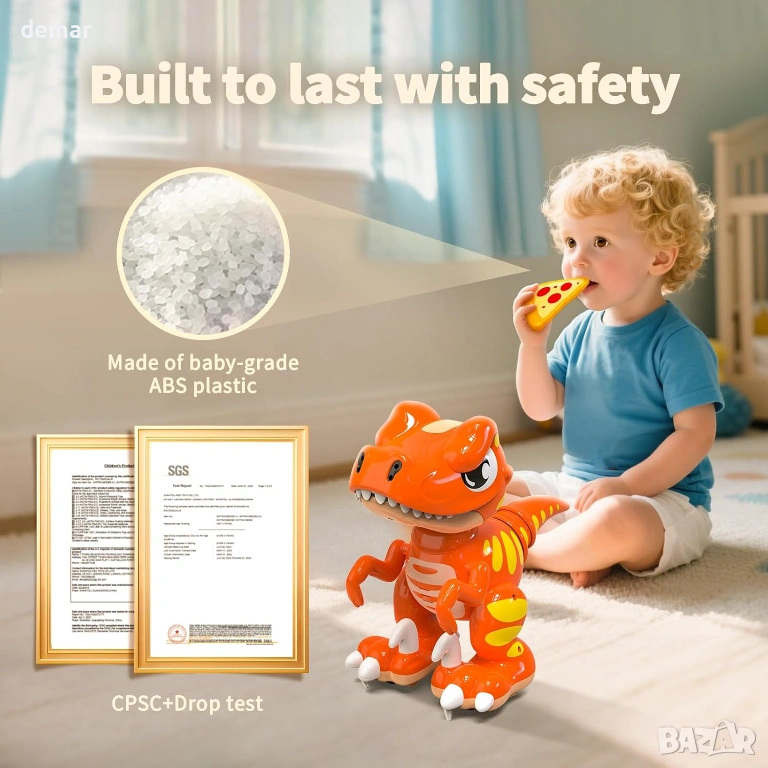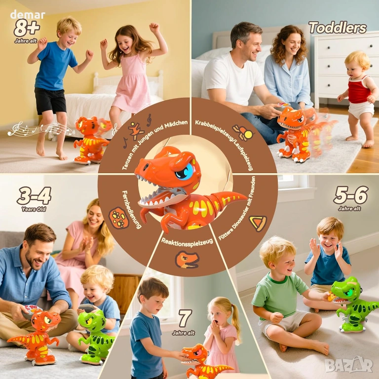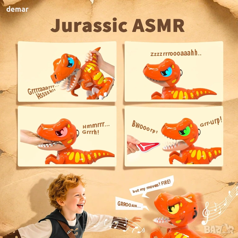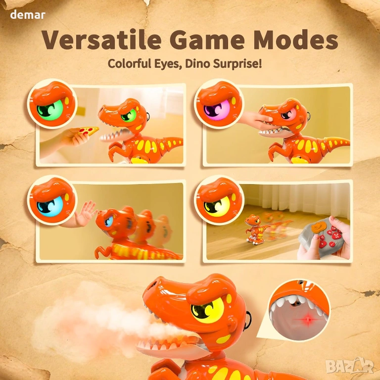 Интерактивна играчка робот динозавър с разпознаване на жестове и 2.4GHz дистанционно управление за пълен контрол на движението, завъртания, танци и мъгливи ефекти, подсилени от отзивчиви светещи очи и реалистични звукови реакции, включително рев и игриви ефекти. Проектирана за многоетапна игра, тя "раста" с децата от просто взаимодействие до по-напреднали социални и мултиплейър предизвикателства, като същевременно служи и като декоративен дисплей, когато не се използва. Изработена от издръжливи, безопасни за деца материали и система с акумулаторни батерии, предлагаща бързо зареждане и ефективно използване на енергията, включително автоматичен режим на заспиване за пестене на енергия. Съчетава ангажиращи STEM-вдъхновени функции със завладяващи светлини, звуци и движение, което я прави подходяща както за игра на закрито, така и на открито и идеална като универсален подарък за различни поводи.
