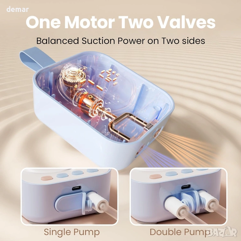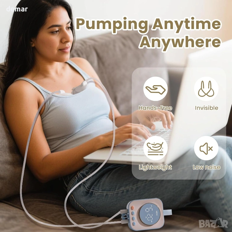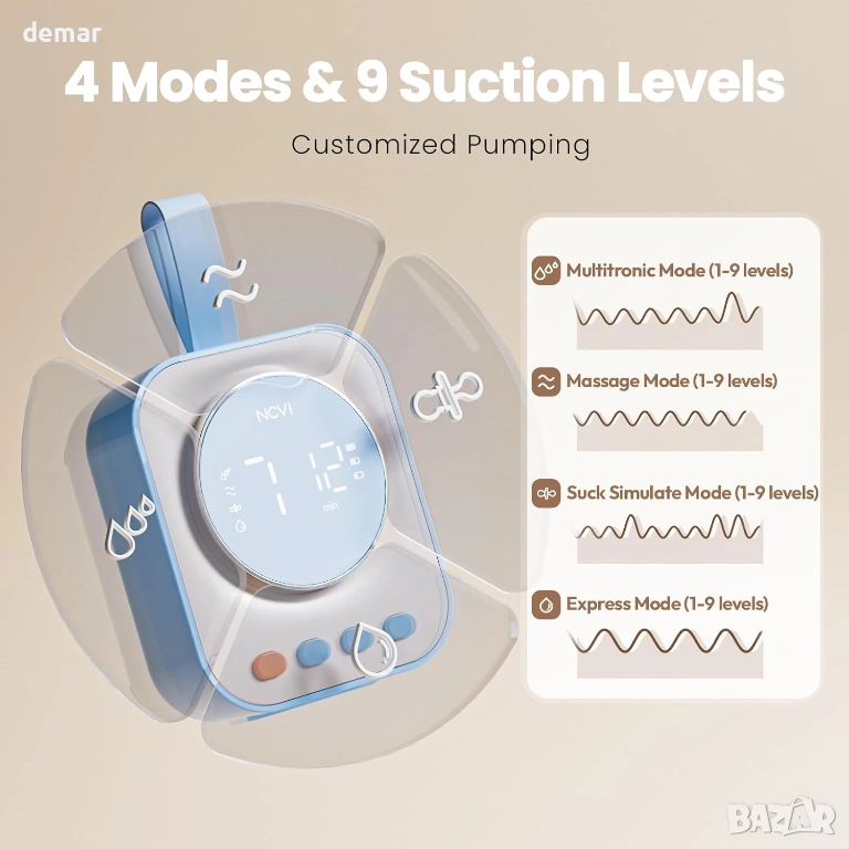 Компактна помпа за кърма без ръце с мощен мотор, осигуряващ засмукване до 300 mmHg за ефективно двуфазно изцеждане, подкрепена от система с двоен клапан за подобрена производителност. Разполага с дълготрайна акумулаторна батерия от 2200 mAh, осигуряваща до 90 минути употреба, с множество опции за зареждане за удобство в движение. Проектирана с 4 режима и 9 регулируеми нива, лесен за четене LED дисплей, вграден таймер и автоматично изключване след 30 минути за безопасна работа. Включва множество размери на фланци за удобно прилягане, устойчив на протичане дизайн против обратен поток и вместимост от 150 мл на чаша. Изработена от материали без BPA, подходящи за храна, с опростена и лесна за почистване структура.