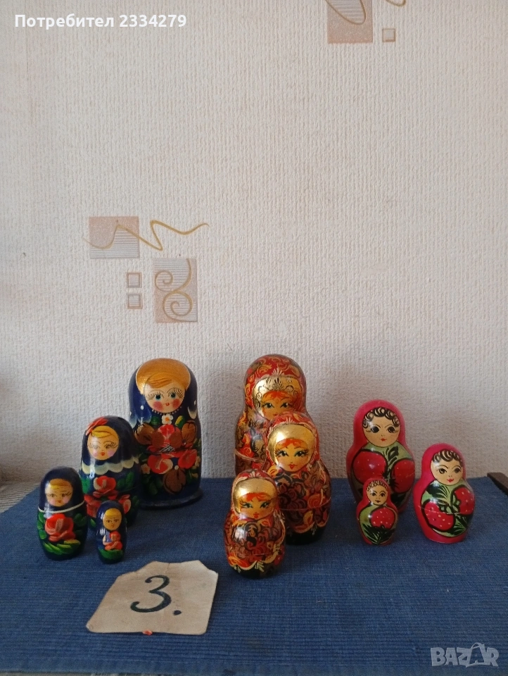 Стара статуетка от порцелан изобразяваща ,,Птица на лозова клонка", произвеждани от немската марка Grafenthal" или унгарската ,,Hollohaza", а може и българско производство, размери 17х10см.,височина 14см., цена 17€.; N:2 Италианска статуетка ,,Майка с дете" изработена от полизерин или алабастър, създадена в Италия през 70-80години,вероятно е дело на твореца Марио Пегораро отзад на основата с инициали ,,М.Р.", цена 30€.; N:3 стара кутийка за енфие,бижута и други дребни предмети, метална дълбоко посребрена, барокови орнаменти, отвътре с дървени стени, размери 8.5х6.5х3см., стара изработка от миналият век в Япония, цена 15€.; N:4 миниатюрен обелиск на египетският цар Тутанкамон, стара малка масивна отливка с размери 5х4см., дебелина 2см., цена 3€.; N:5 стар дървен комплект матрьошки, ръчно изработени рисувани през 60-80години на миналият век в СССР, влагащи се една в друга, размер на голямата 14х7см., цена 7€.; N:6 стара метална играчка от 60-70те години на миналият век,размери 16х8х6см.,механична с ключе,движеща се но има проблем с прожината, цена 3€.