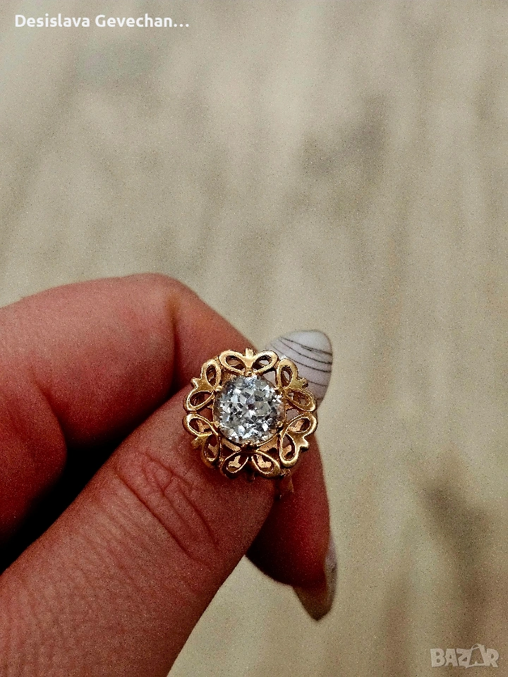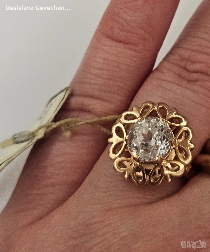Продавам уникален руски златен пръстен, истинска класика от епохата на СССР. Бижуто е в отлично състояние, като към него е запазен оригиналният хартиен етикет на производител „Ювелирпром“, което гарантира неговия произход и ч.истота на метала.Централно разположен голям искрящ камък синтетичен корунд, поставен в красива ажурна обковка тип „кошница“ с флорални мотиви. Размер 58, 5.77 грама