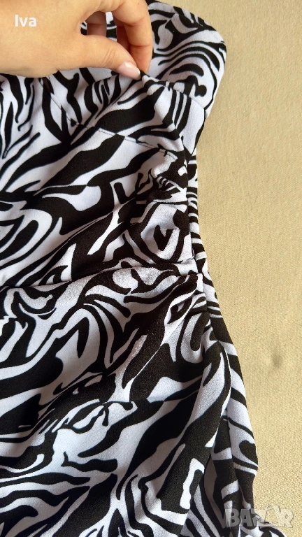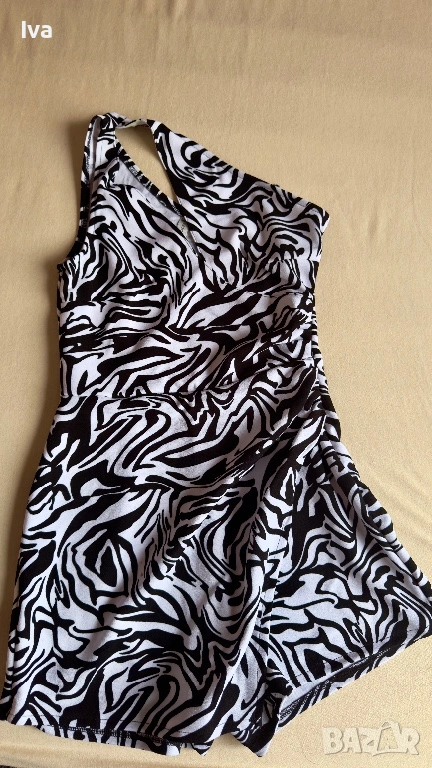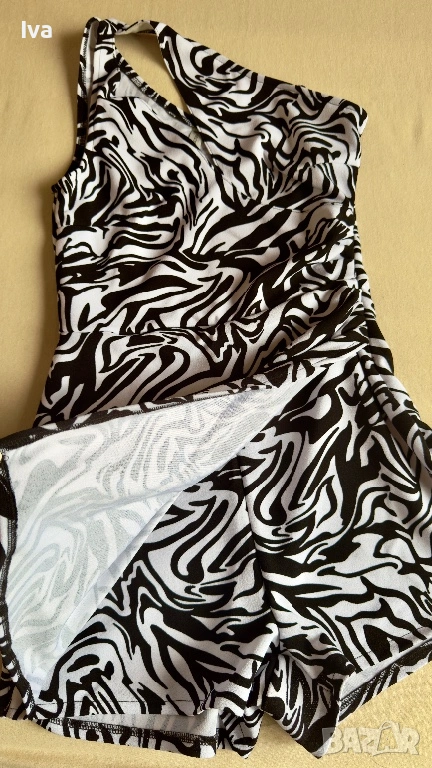 Черно-бял гащеризон със зебра принт с пола-панталон долна част и изрязан елемент на бюста → Обява 54016840