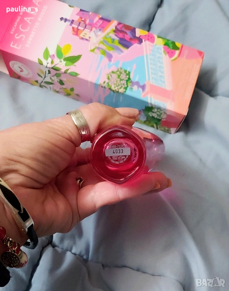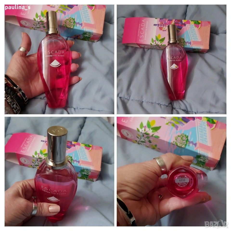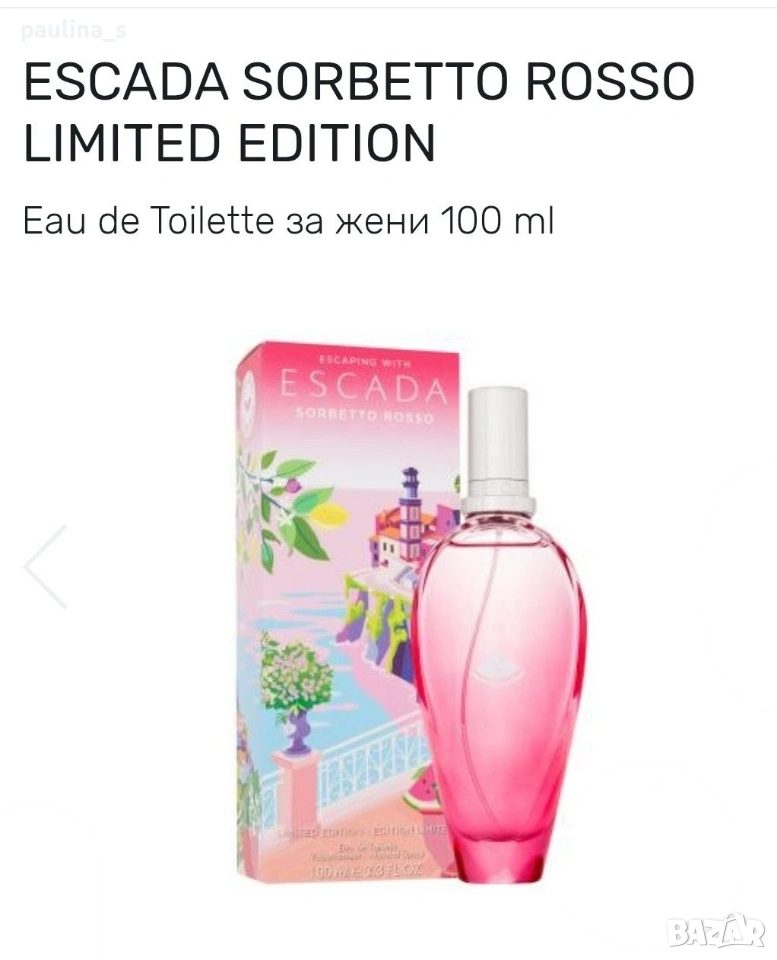 1️⃣. Колаж Sorbetto rosso" limited edition by Escada / 100ml EDT. Рядка находка, спрян! Цената е крайна, без пазарлъци 48 евро. Дамски дизайнерски парфюм, част от личната ми колекция, лимитирани серия. Пълна презентация, продукт с кутия, липсват 3 спрея за тест. Съхраняван е на тъмно и в кутията. Новото лимитирано лятно издание на Escada за сезон 2018 се казва Sorbetto Rosso и ще бъде пуснато на пазара през януари. Новият аромат съдържа нотки на средиземноморски овощни градини и освежаващи акорди на морска сол, с доминираща плодова нотка на диня в сърцето. Sorbetto Rosso е анонсиран като свеж плодов аромат, вдъхновен от духа и ароматите на италианското крайбрежие, по-точно Амалфи.
