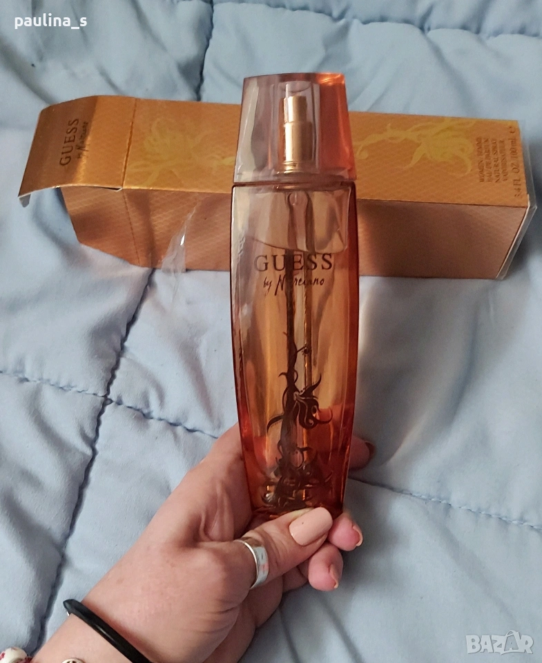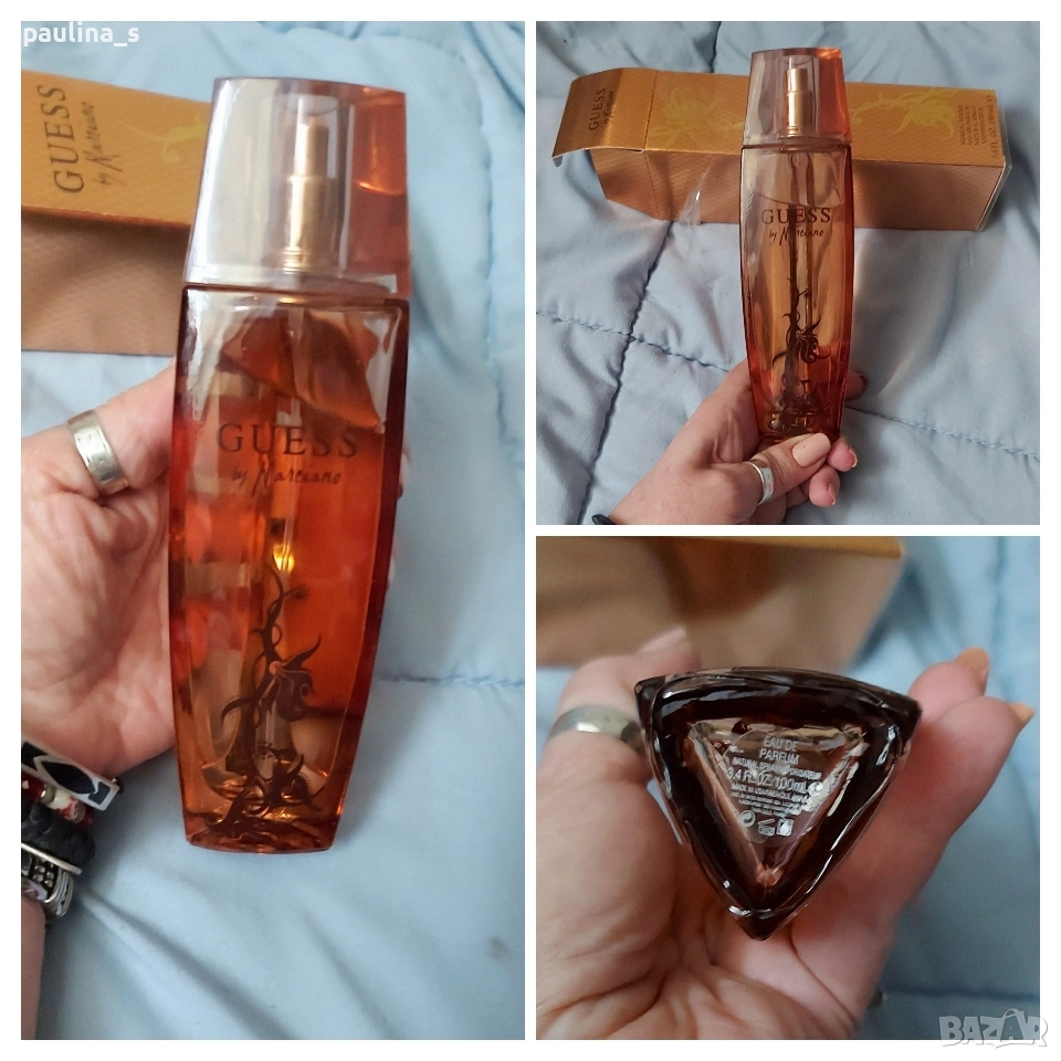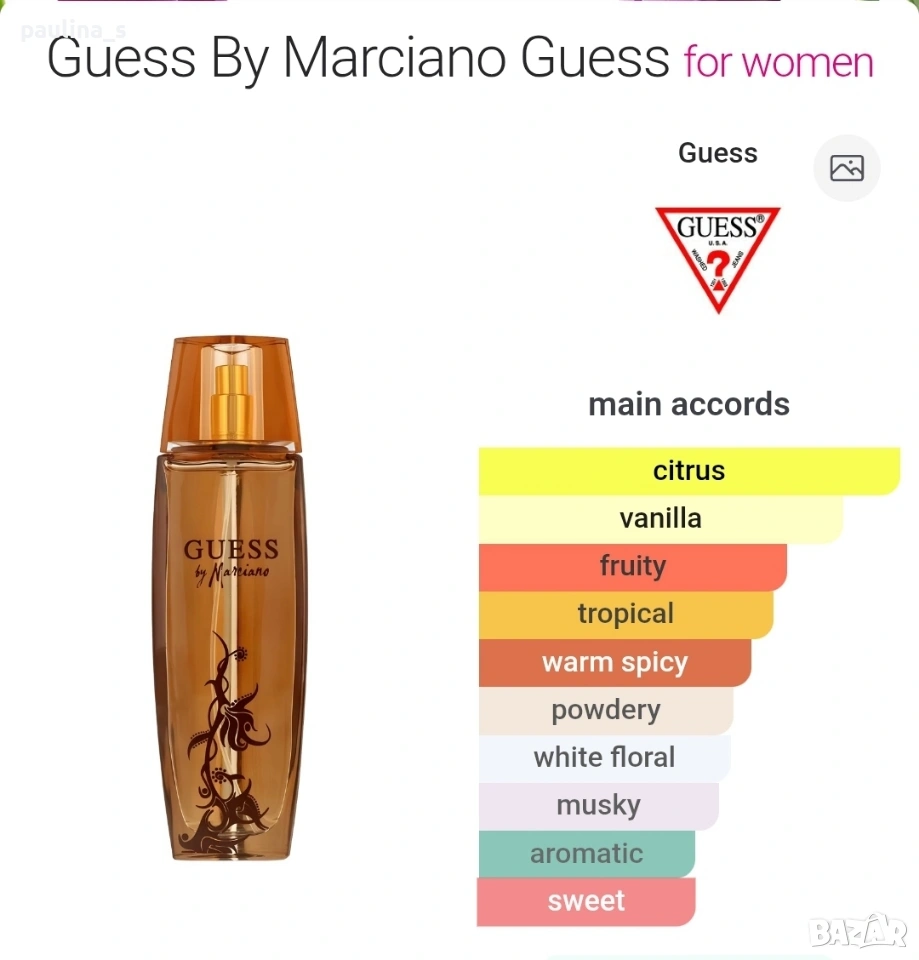 5️⃣ Колаж / "Guess By Marciano" by Guess / 100ml EDP. Цената е крайна, без пазарлъци 32 евро. Част от личната ми колекция, които никога не е ползван, стар бач код, пълна презентация, продукт с кутия, съхраняван е на тъмно и в кутията! Информация и ароматната пирамида са от Фрагрантика. Това е флорално-плодов аромат за жени. Автор на този аромат е Barbara Zoebelein. Връхни нотки са кюрасао, кардамон, карамбола (звезден плод) и грейпфрут; средни нотки са орлови нокти, жасмин и божур; базови нотки са ванилия, мускус и дървесни нотки.