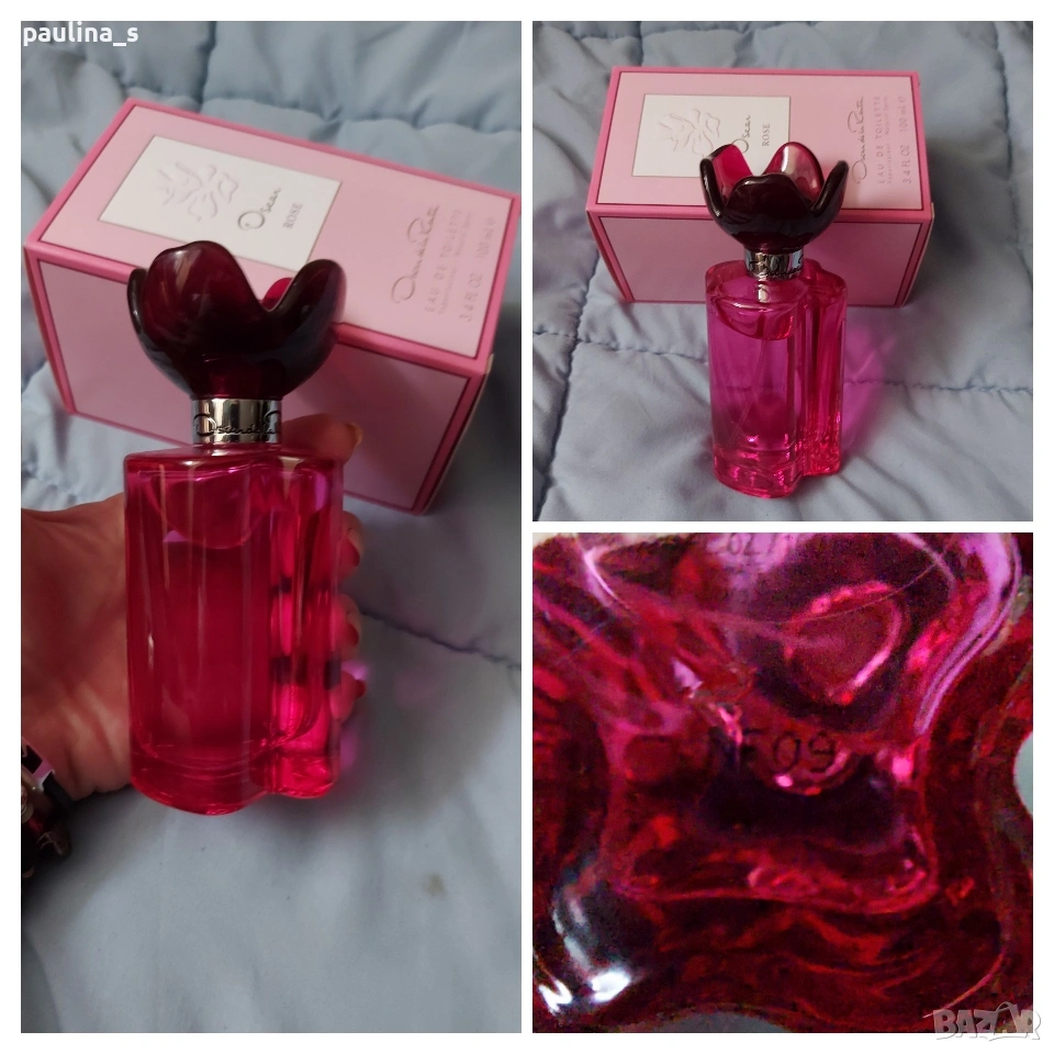 3️⃣. Колаж / Дамски парфюм "Rose" by Oscar de la Renta 100ml EDT. Цената е крайна, без пазарлъци 49 евро! DO NOT BARGAIN, PLEASE! Дамски дизайнерски парфюм с доказано качество, липсват 2 спрея за тест, нов, пълна презентация, продукт с кутия, част от личната ми колекция. Съхраняван е на тъмно и в кутията, Стар Бач код - NF09, Made in USA.