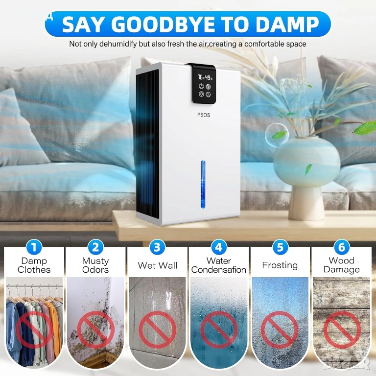 Високоефективен домашен обезвлажнител】 Домашният обезвлажнител PSOS използва полупроводникова кондензационна технология за ефективно отстраняване на влагата от въздуха, в затворено помещение при 86°F и 80% относителна влажност, той може да събере до 40 унции вода за 24 часа, съхранява оптимална влажност под 45% и консумират много малко енергия (не повече от 1 kWh на ден). Създайте комфортна атмосфера за вашето пространство. да живеят.