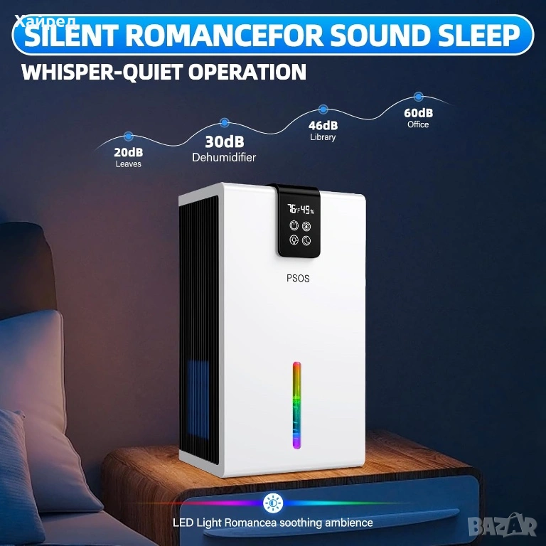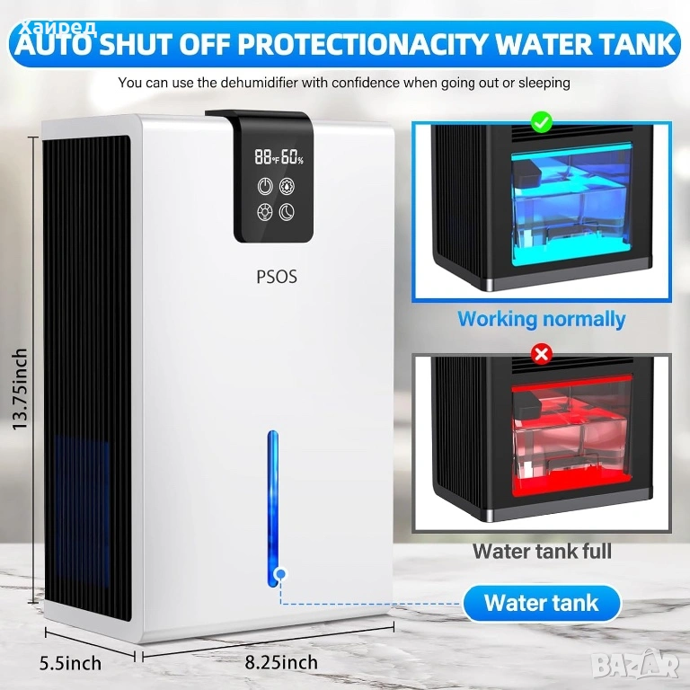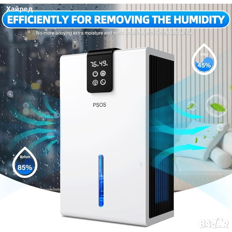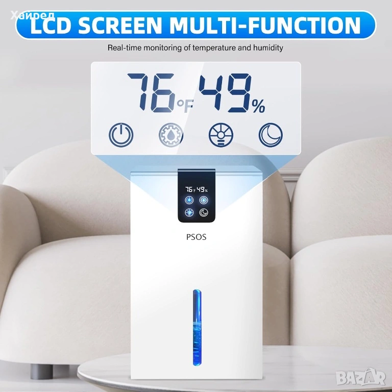 Нов Влагоуловител PSOS, 2.8L, сензорен екран, детекция на влажност и температура, бял, 210x150x360mm